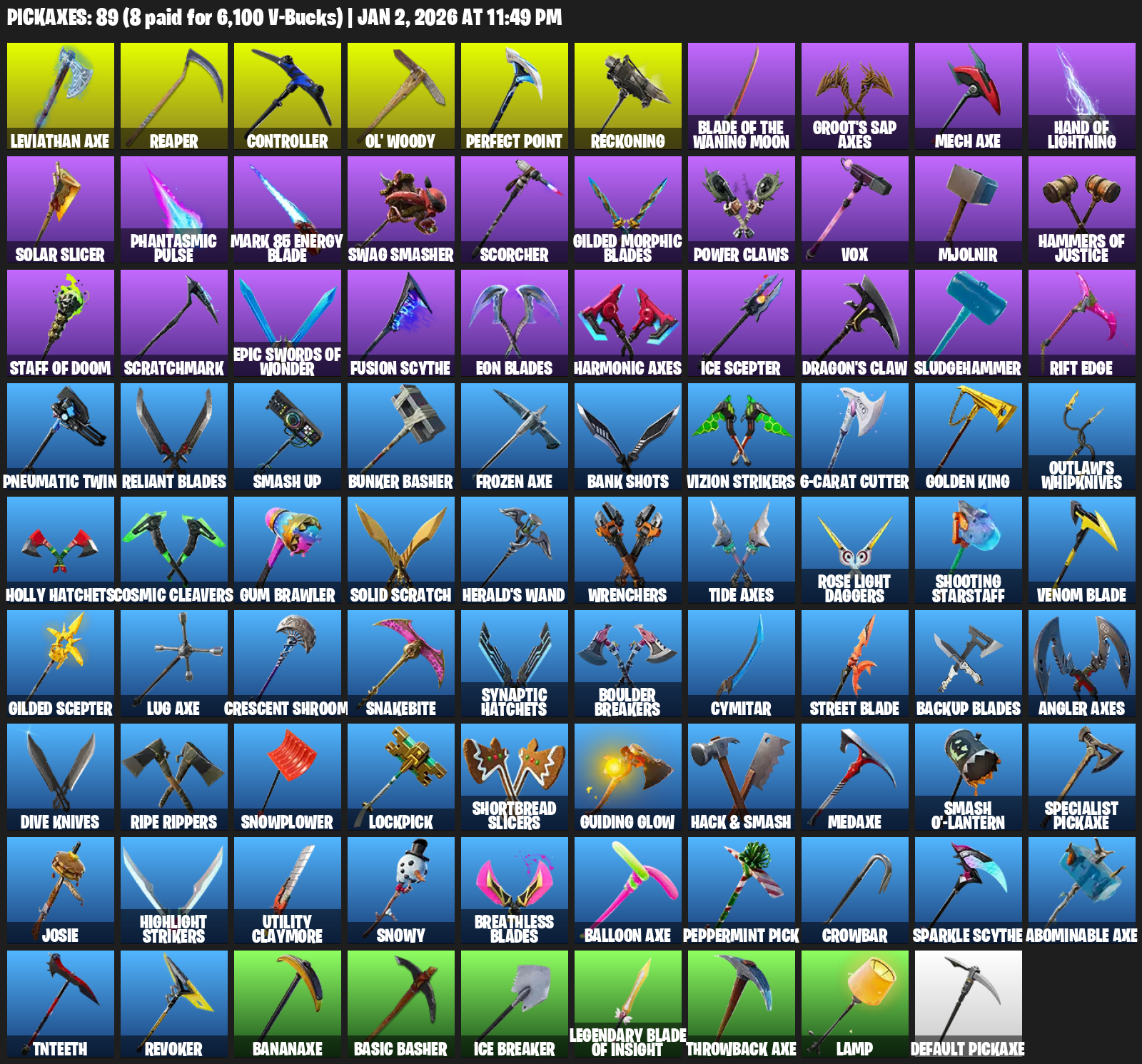 Leviathan Axe, Reaper, Controller, Ol’ Woody, Reckoning, Groot’s Sap Axes, Hand of Lightning, Solar Slicer, Phantasmic Pulse, Mark 85 Energy Blade, Swag Smasher, Scorcher, Gilded Morphic Blades, Power Claws, Vox, Mjolnir