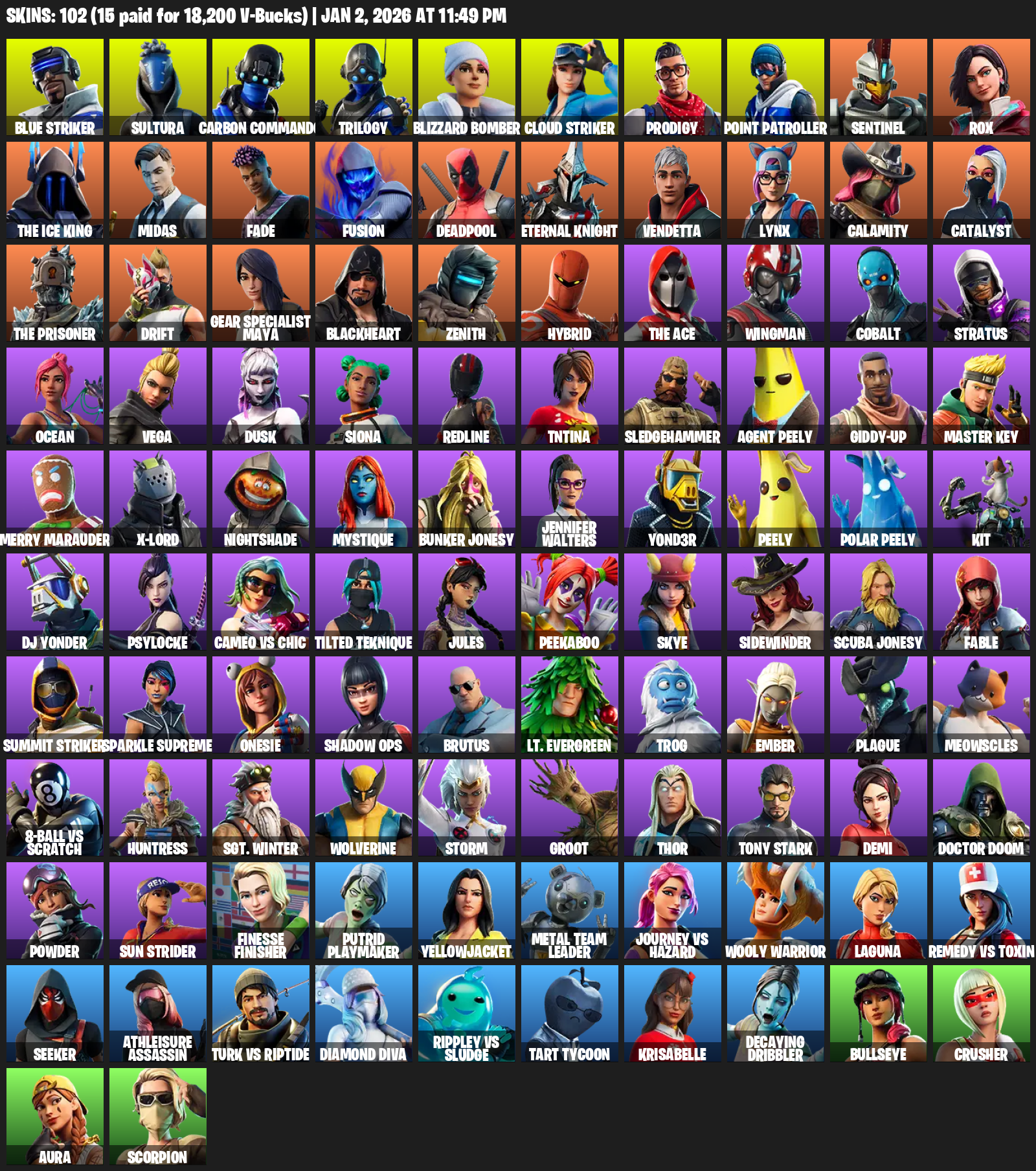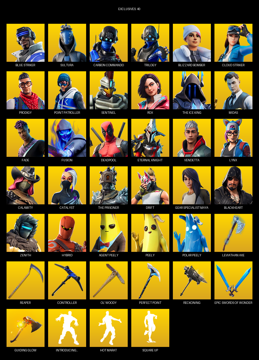 Point Patroller, Gear Specialist Maya, Blue Striker, Sultura, Carbon Commando, Trilogy, Blizzard Bomber, Prodigy, Sentinel, Rox, The Ice King, Midas, Fade, Fusion, Deadpool, Eternal Knight, Vendetta, Lynx, Calamity