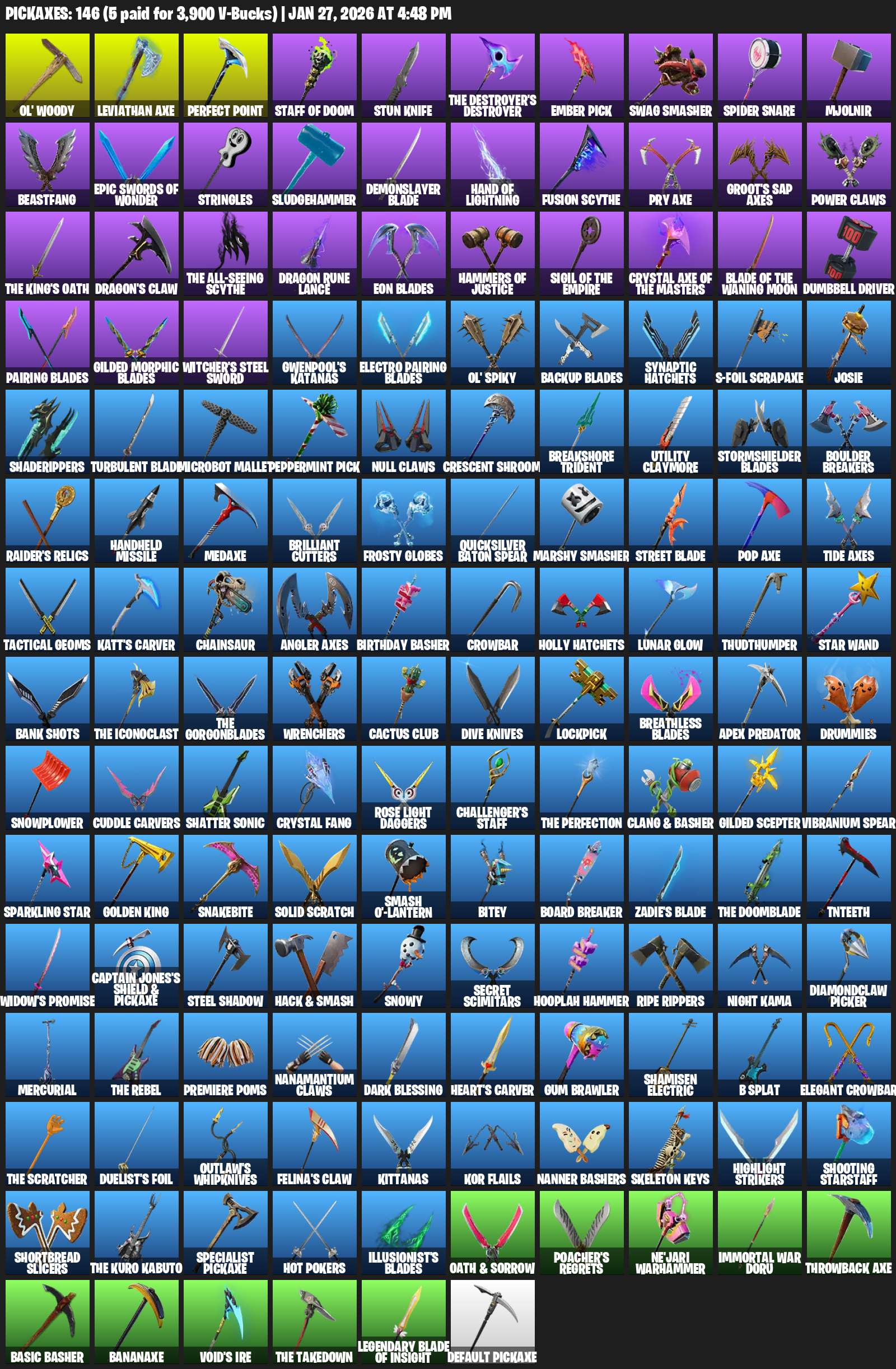 Leviathan Axe, Ol’ Woody, Staff of Doom, Stun Knife, The Destroyer’s Destroyer, Ember Pick, Swag Smasher, Spider Snare, Mjolnir, Beastfang, Stringles, Sludgehammer, Demonslayer Blade, Groot’s Sap Axes, Power Claws