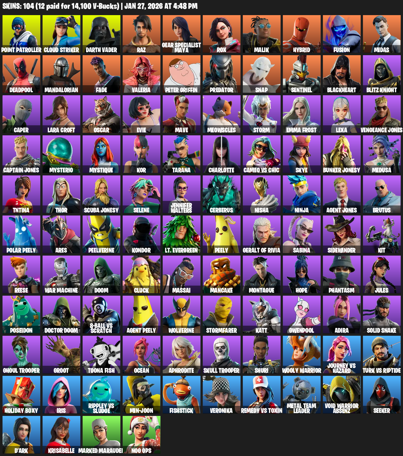 [PC/XBOX] | 104 skins | 500 V-bucks | Leviathan Axe | Lara Croft | Point Patroller | Cloud Striker | Darth Vader | Raz | #NGS8729