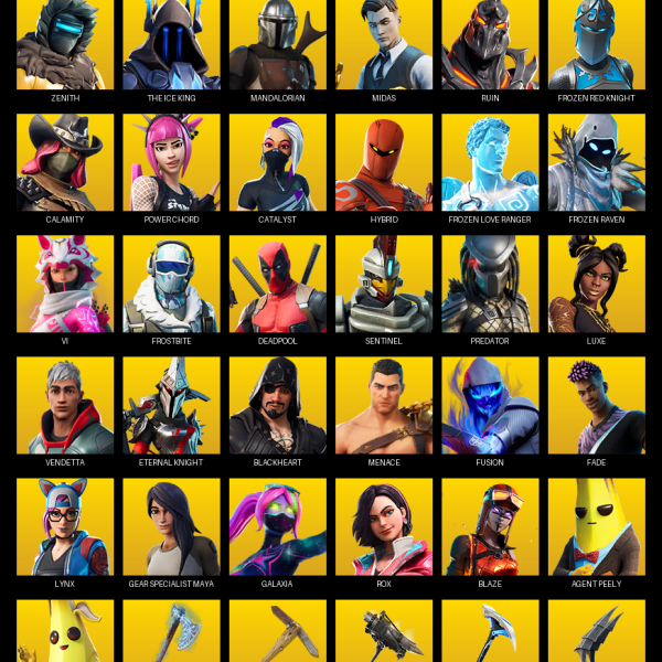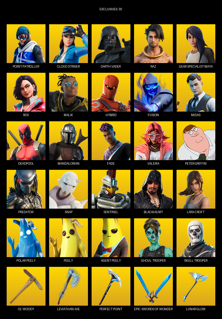 Point Patroller, Gear Specialist Maya, Lara Croft, Cloud Striker, Darth Vader, Raz, Rox, Malik, Hybrid, Fusion, Midas, Deadpool, Mandalorian, Fade, Valeria, Peter Griffin, Predator, Snap, Sentinel, Blackheart