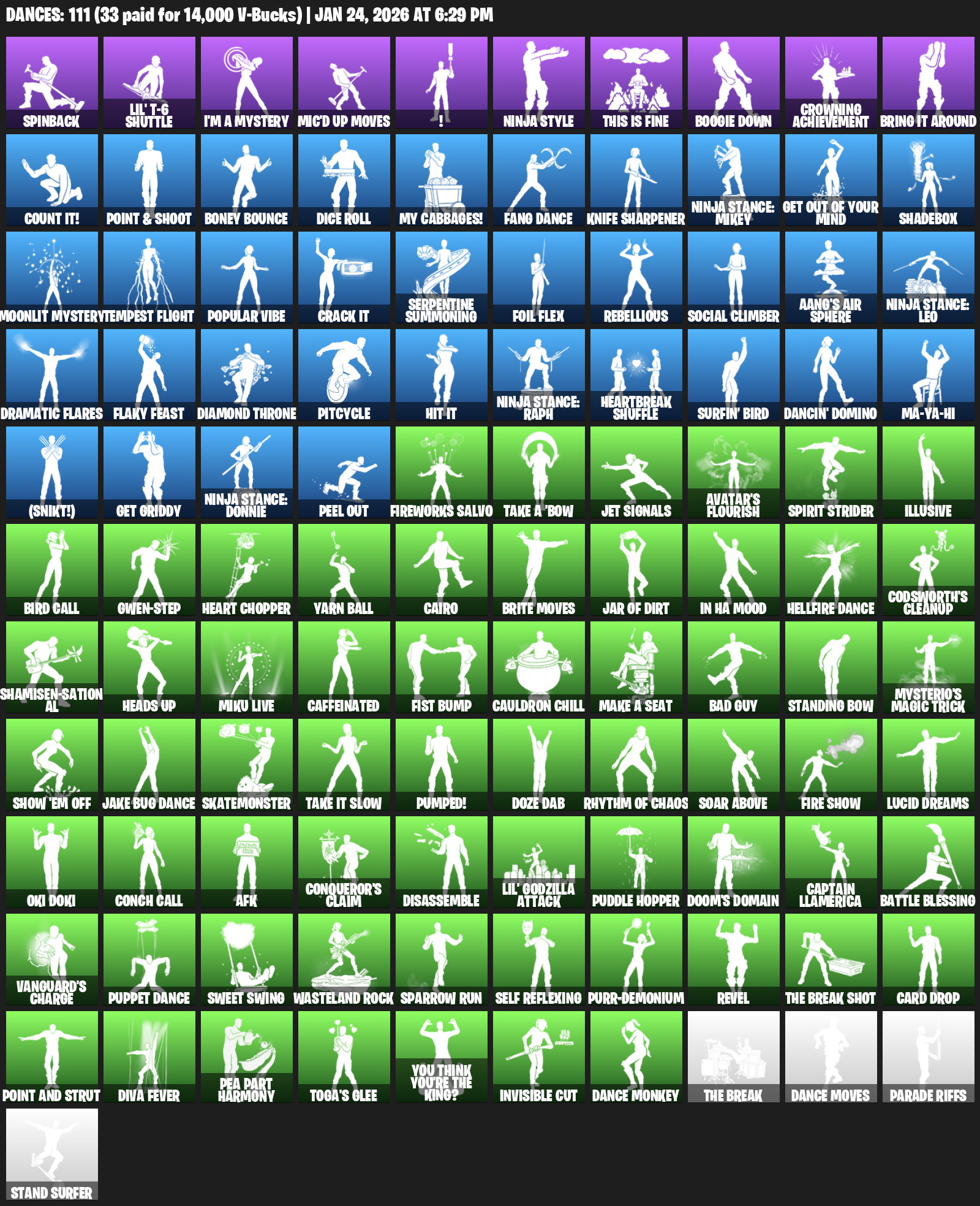 Spinback, I’m a Mystery, Mic’d Up Moves, !, Ninja Style, This is Fine, Boogie Down, Crowning Achievement, Bring it around, Count It!, Point & Shoot, Boney Bounce, Dice Roll, My Cabbages!, Fang Dance, Get Out of Your Mind, Shadebox