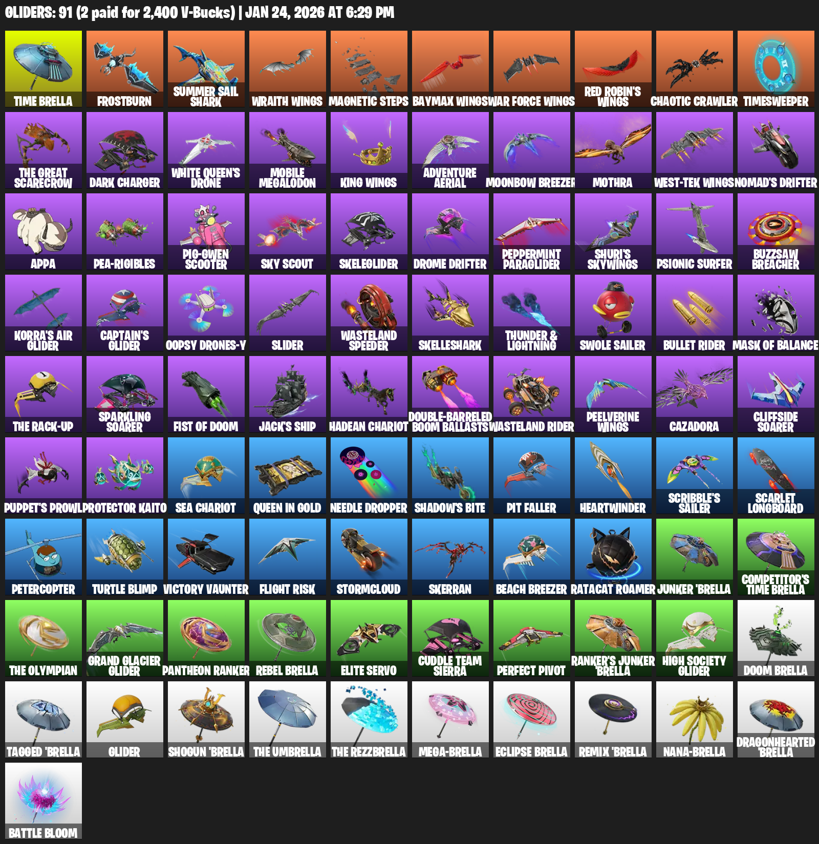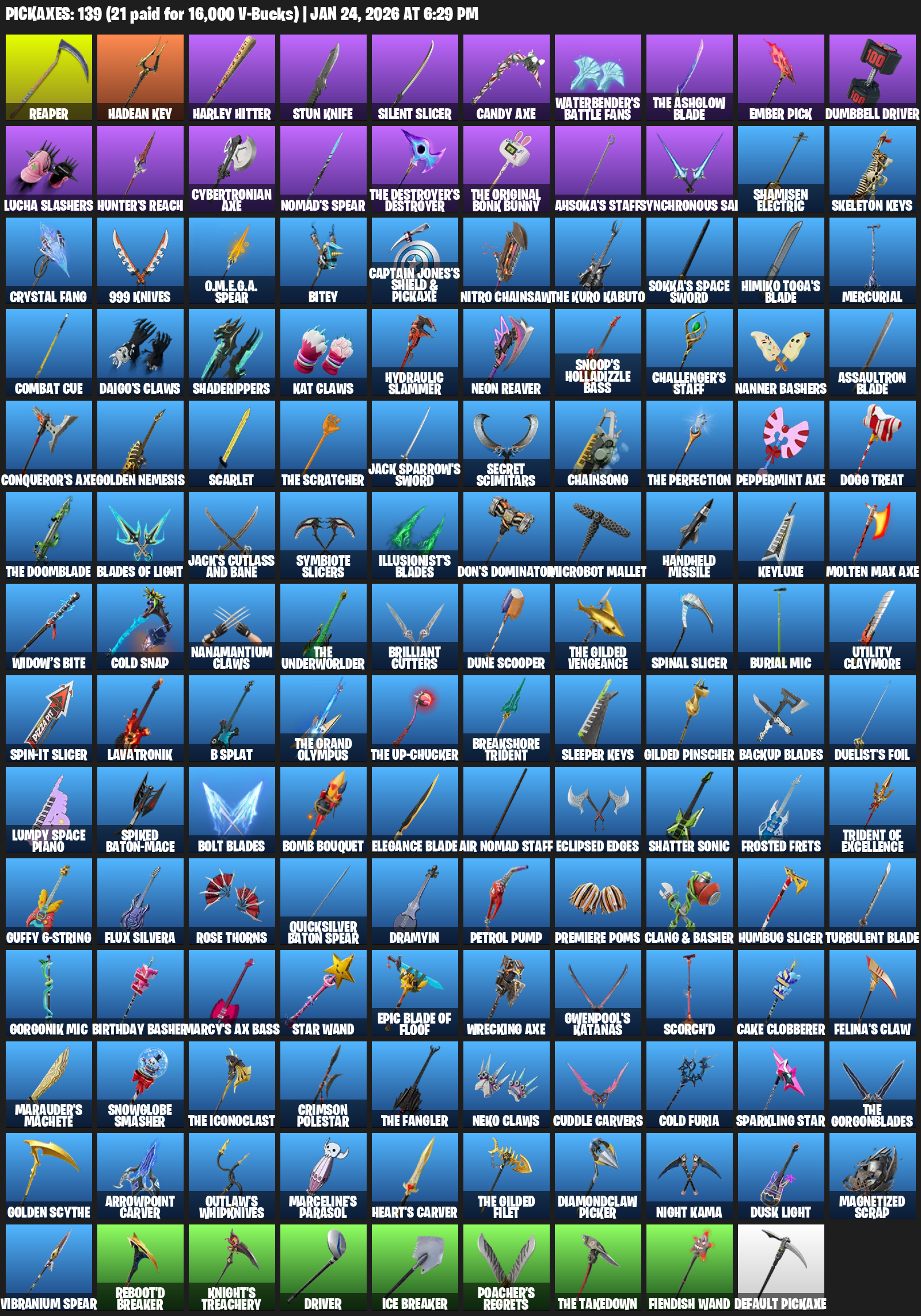 Reaper, Hadean Key, Harley Hitter, Stun Knife, Silent Slicer, Candy Axe, Waterbender’s Battle Fans, The Ashglow Blade, Ember Pick, Dumbbell Driver, Lucha Slashers, Hunter’s Reach, Nomad’s Spear, Ahsoka’s Staff, Synchronous Sai, Shamisen Electric, Skeleton Keys