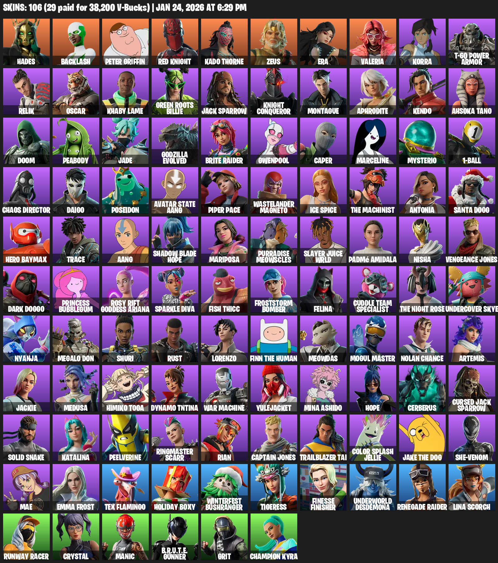 Renegade Raider, Hades, Backlash, Peter Griffin, Red Knight, Kado Thorne, Zeus, Era, Valeria, Korra, T-60 Power Armor, Relik, Oscar, Khaby Lame, Green Roots Billie, Jack Sparrow, Montague, Aphrodite, Kendo