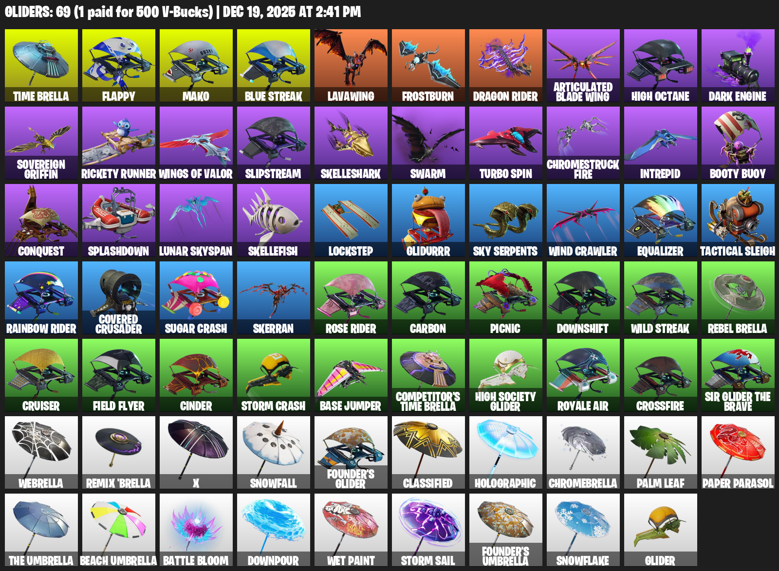 Mako, Time Brella, Flappy, Lavawing, Frostburn, Articulated Blade Wing, Sovereign Griffin, Rickety Runner, Wings of Valor, Slipstream, Skelleshark, Swarm, Turbo Spin, Chromestruck Fire, Intrepid, Booty Buoy