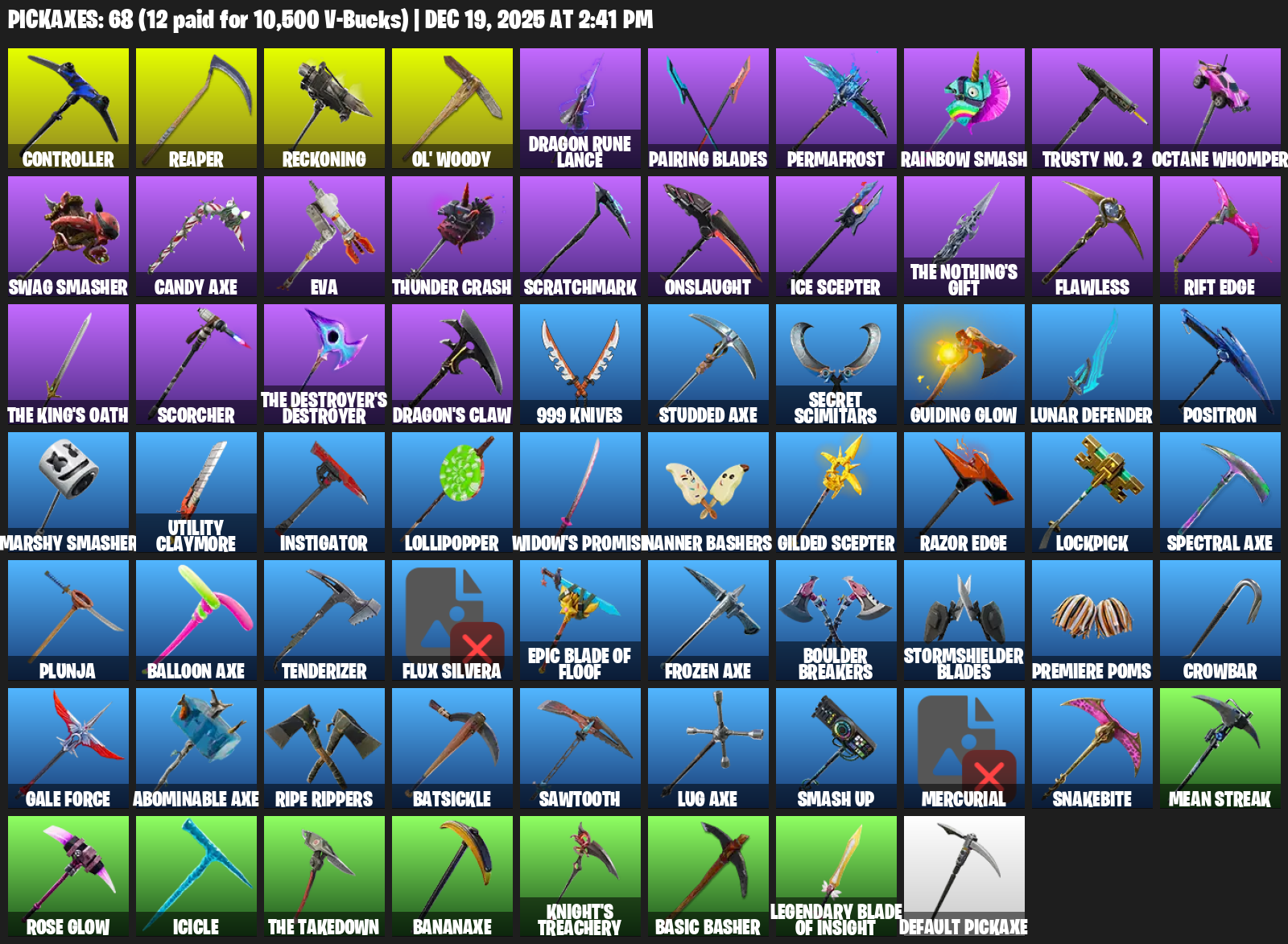 Controller, Reckoning, Ol’ Woody, Dragon Rune Lance, Pairing Blades, Permafrost, Rainbow Smash, Trusty No. 2, Octane Whomper, Swag Smasher, Candy Axe, EVA, Thunder Crash, Scratchmark, Onslaught, Ice Scepter, Flawless, Rift Edge