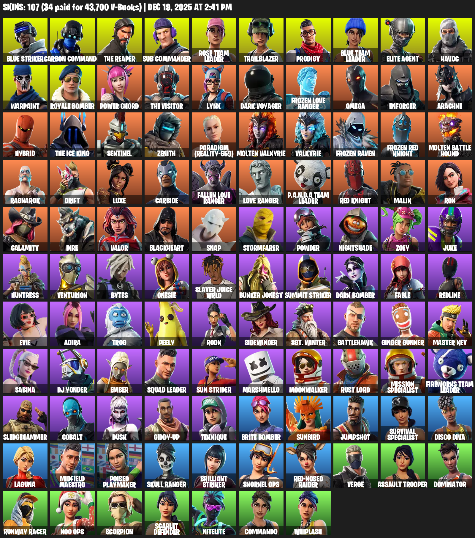 The Reaper, Elite Agent, Omega, Blue Striker, Carbon Commando, Sub Commander, Rose Team Leader, Trailblazer, Prodigy, Havoc, Warpaint, Royale Bomber, Power Chord, Lynx, Dark Voyager, Frozen Love Ranger, Enforcer, Arachne