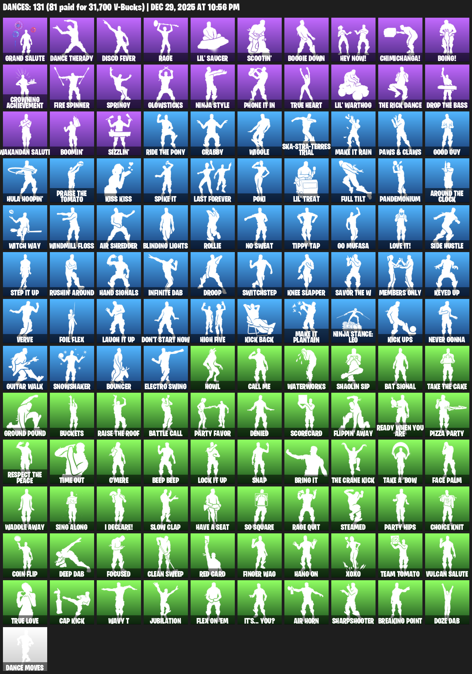Grand Salute, Dance Therapy, Disco Fever, Rage, Lil’ Saucer, Scootin’, Boogie Down, Hey Now!, Chimichanga!, Boing!, Crowning Achievement, Fire Spinner, Springy, Glowsticks, Ninja Style, Phone It In, True Heart