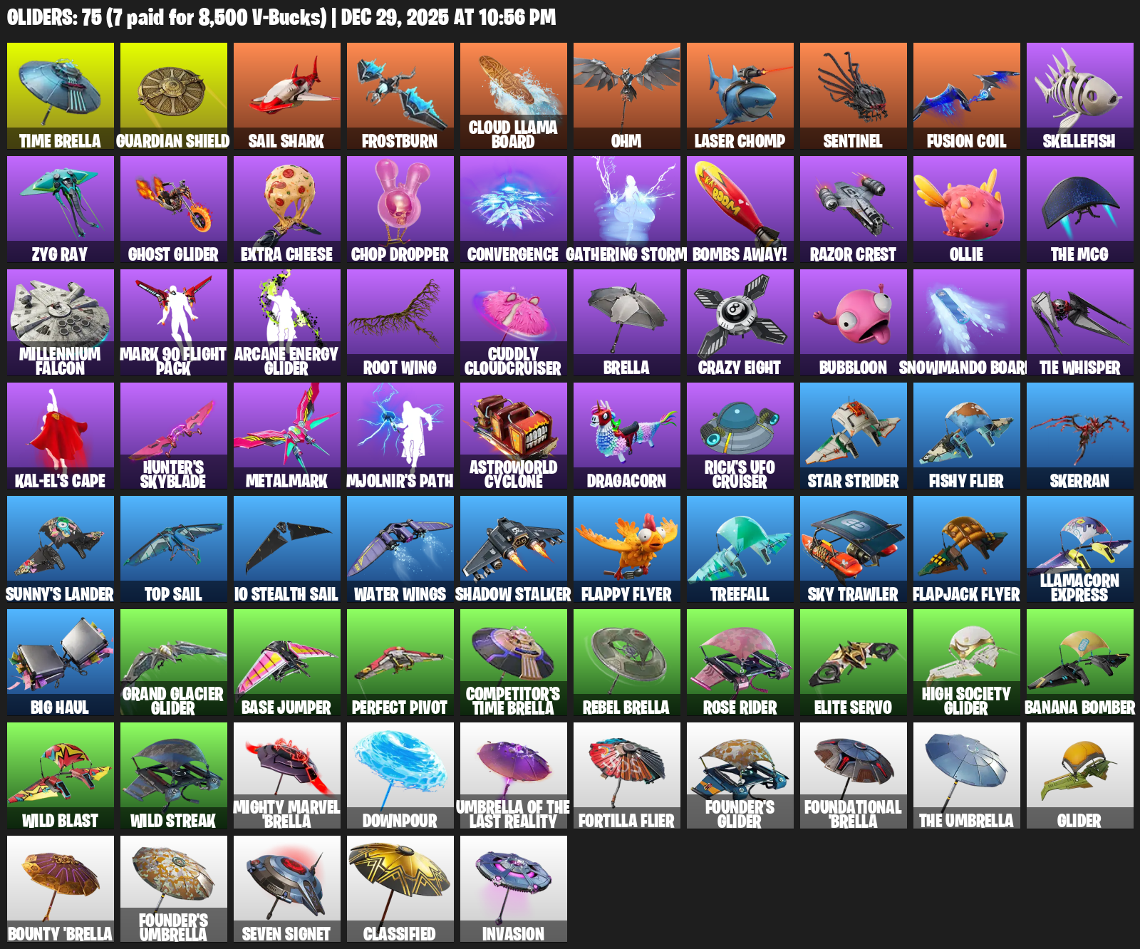 Time Brella, Sail Shark, Frostburn, Cloud Llama Board, Ohm, Laser Chomp, Sentinel, Skellefish, Zyg Ray, Ghost Glider, Extra Cheese, Chop Dropper, Convergence, Gathering Storm, Bombs Away!, Razor Crest, Ollie
