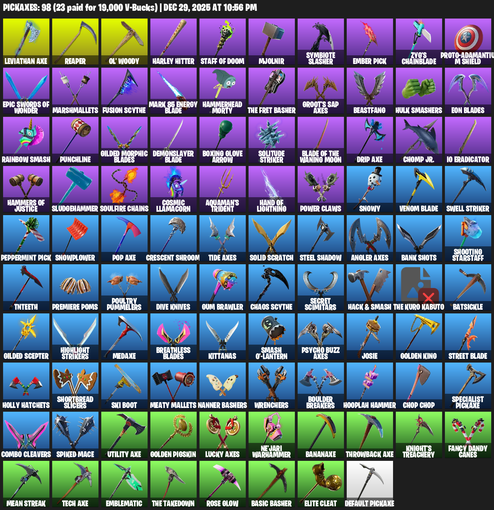 Reaper, Ol’ Woody, Harley Hitter, Staff of Doom, Mjolnir, Symbiote Slasher, Ember Pick, Zyg’s Chainblade, Proto-Adamantium Shield, Marshmallets, Fusion Scythe, Mark 85 Energy Blade, Hammerhead Morty, Groot’s Sap Axes, Beastfang, Hulk Smashers, Eon Blades