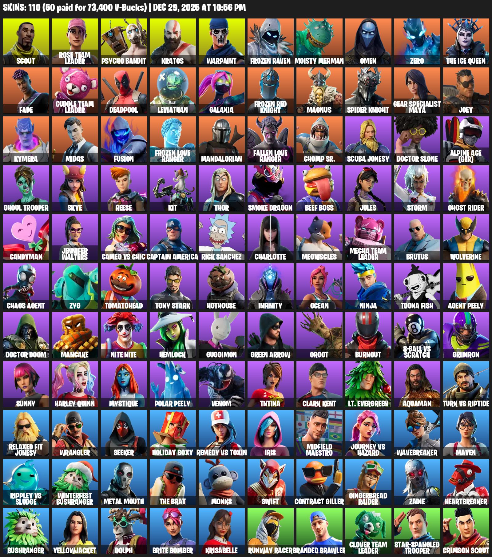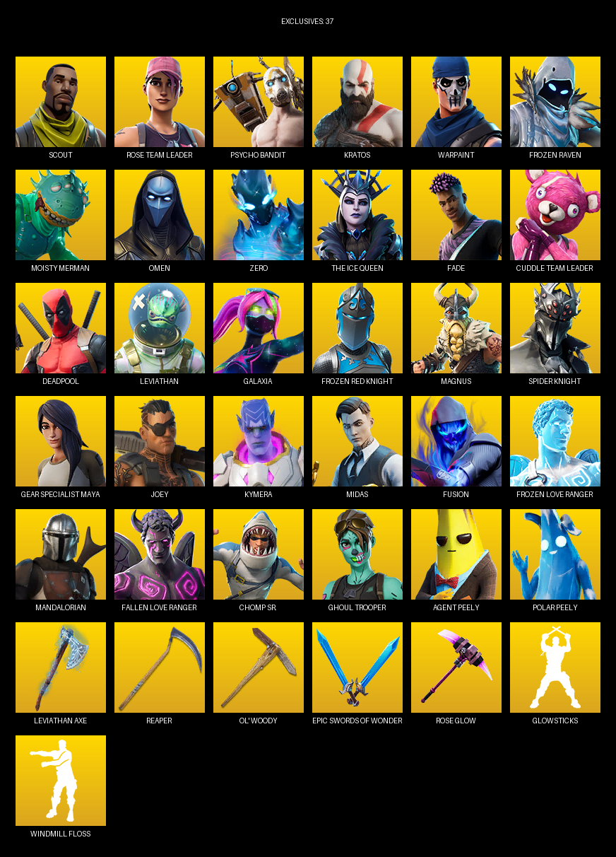 Gear Specialist Maya, Scout, Rose Team Leader, Psycho Bandit, Kratos, Warpaint, Frozen Raven, Moisty Merman, Omen, Zero, The Ice Queen, Fade, Deadpool, Leviathan, Galaxia, Magnus, Spider Knight, Joey