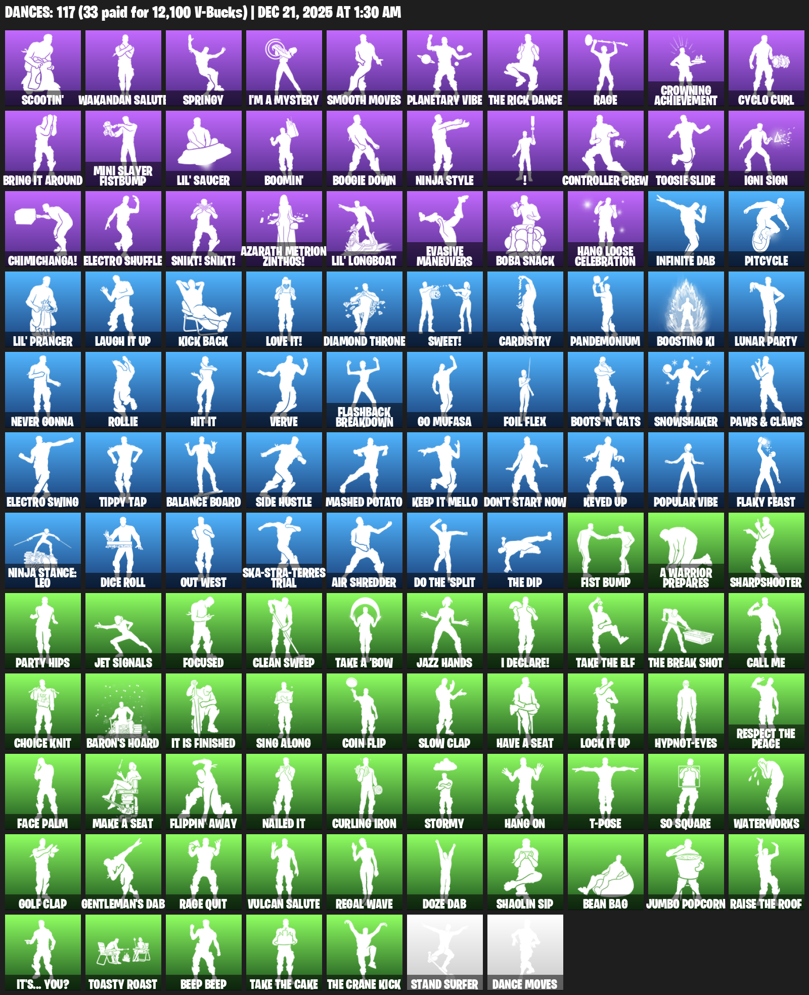 Scootin’, Wakandan Salute, Springy, I’m a Mystery, Smooth Moves, Planetary Vibe, Rage, Crowning Achievement, Cyclo Curl, Bring it around, Mini Slayer Fistbump, Lil’ Saucer, Boomin’, Boogie Down, Ninja Style, !, Controller Crew, Toosie Slide, Igni Sign