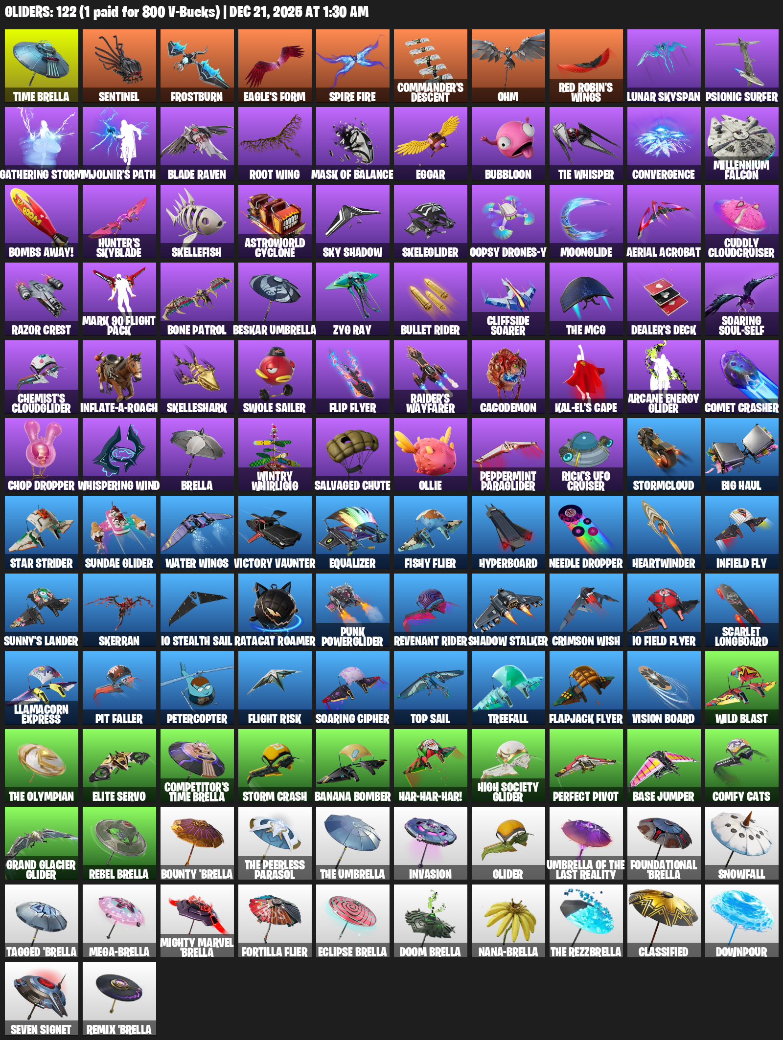 Time Brella, Sentinel, Frostburn, Eagle’s Form, Commander’s Descent, Ohm, Red Robin’s Wings, Lunar Skyspan, Psionic Surfer, Gathering Storm, Mjolnir’s Path, Blade Raven, Root Wing, Eggar, Bubbloon, TIE Whisper, Convergence, Millennium Falcon