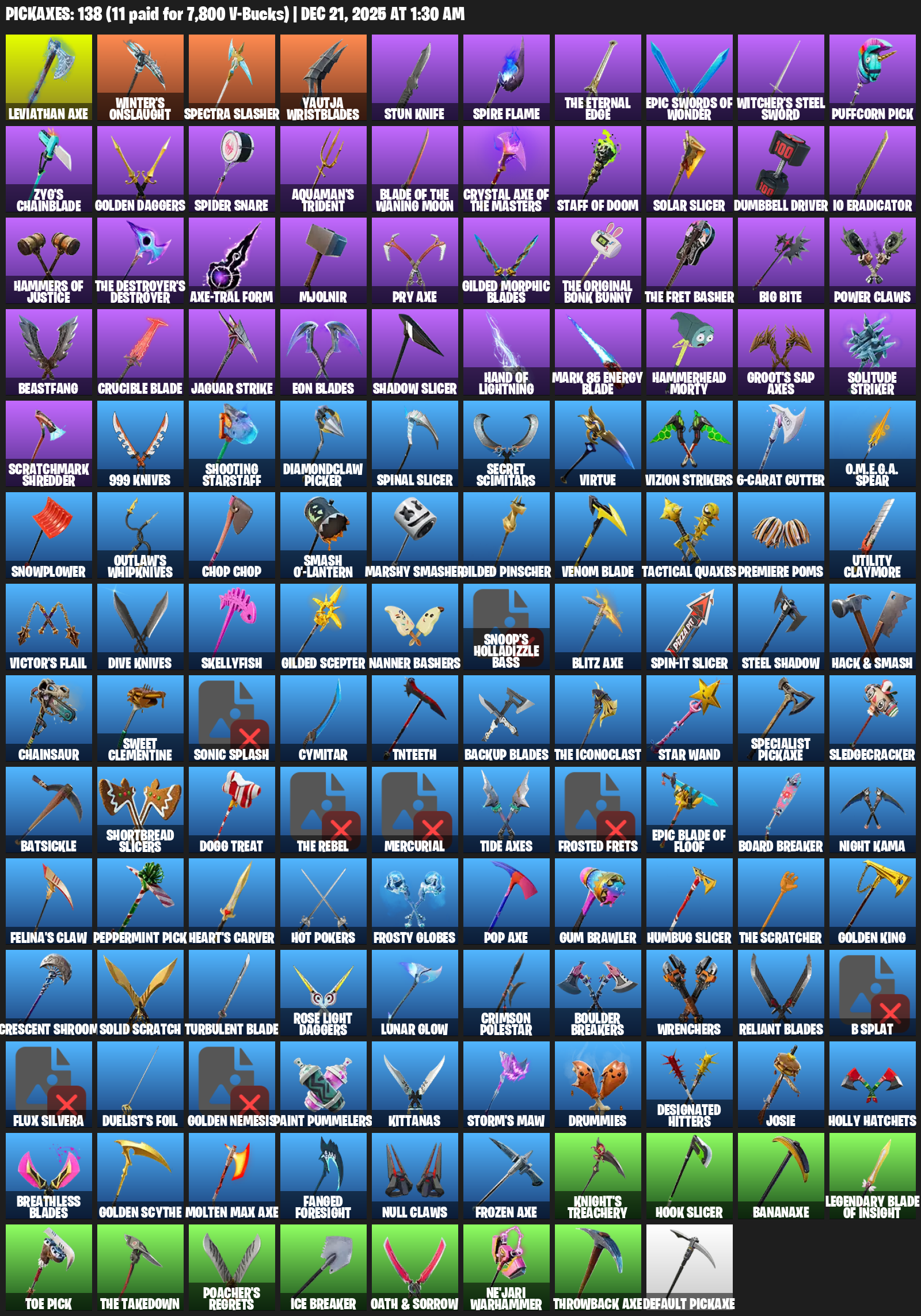 Leviathan Axe, Winter’s Onslaught, Yautja Wristblades, Stun Knife, The Eternal Edge, Witcher’s Steel Sword, Puffcorn Pick, Zyg’s Chainblade, Golden Daggers, Spider Snare, Aquaman’s Trident, Staff of Doom, Solar Slicer, Dumbbell Driver, IO Eradicator
