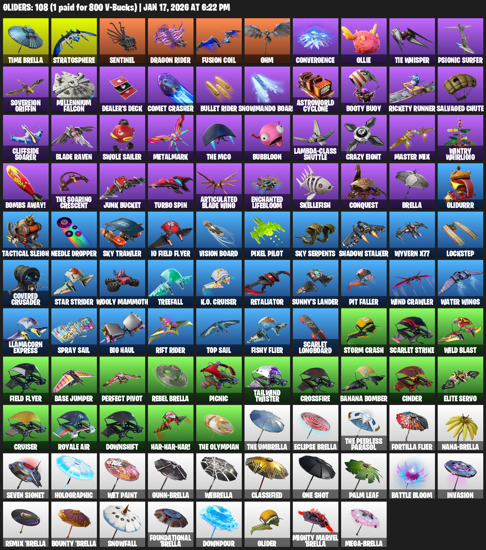 Time Brella, Stratosphere, Dragon Rider, Ohm, Convergence, Ollie, TIE Whisper, Psionic Surfer, Sovereign Griffin, Millennium Falcon, Dealer’s Deck, Comet Crasher, Snowmando Board, Astroworld Cyclone, Booty Buoy, Rickety Runner, Salvaged Chute