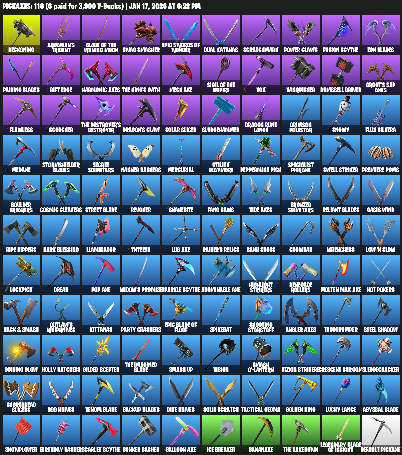 Reckoning, Aquaman’s Trident, Swag Smasher, Dual Katanas, Scratchmark, Power Claws, Fusion Scythe, Eon Blades, Rift Edge, Harmonic Axes, Mech Axe, Vox, Vanquisher, Dumbbell Driver