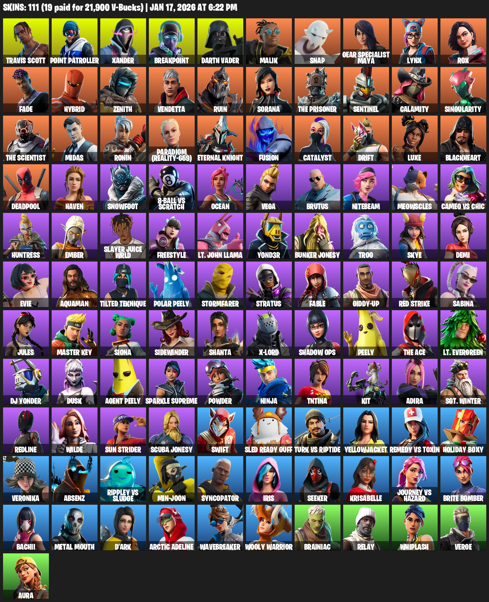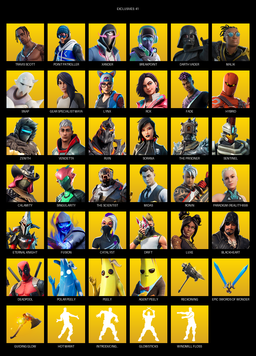 Travis Scott, Point Patroller, Gear Specialist Maya, Xander, Breakpoint, Darth Vader, Malik, Snap, Lynx, Rox, Fade, Hybrid, Zenith, Vendetta, Ruin, Sorana, The Prisoner, Sentinel, Calamity, Singularity