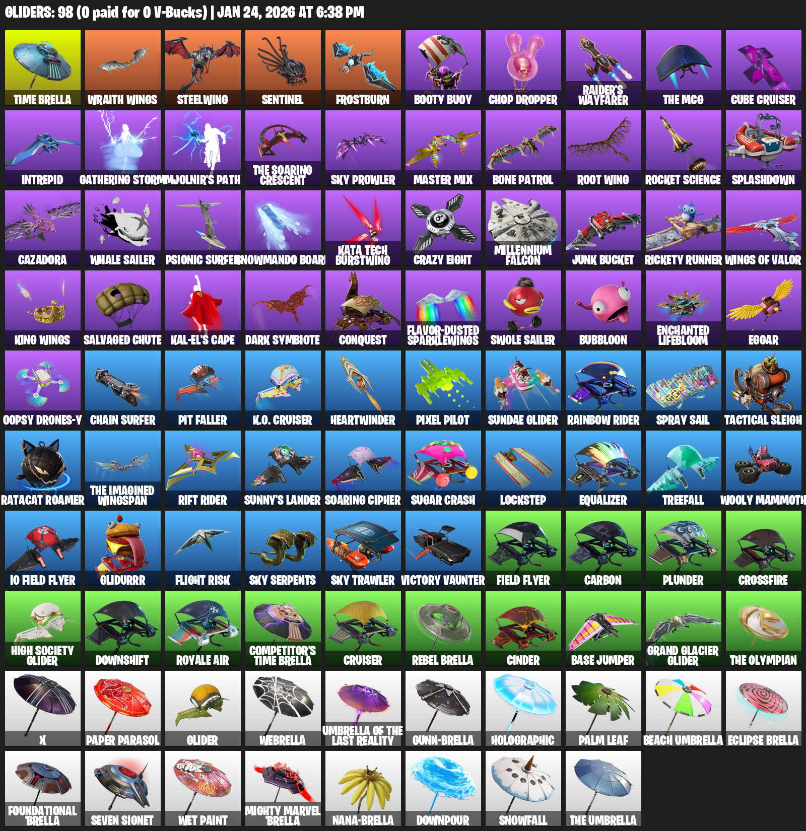 Time Brella, Wraith Wings, Steelwing, Sentinel, Frostburn, Booty Buoy, Chop Dropper, Raider’s Wayfarer, Cube Cruiser, Intrepid, Gathering Storm, Mjolnir’s Path, Sky Prowler, Bone Patrol, Root Wing, Rocket Science, Splashdown