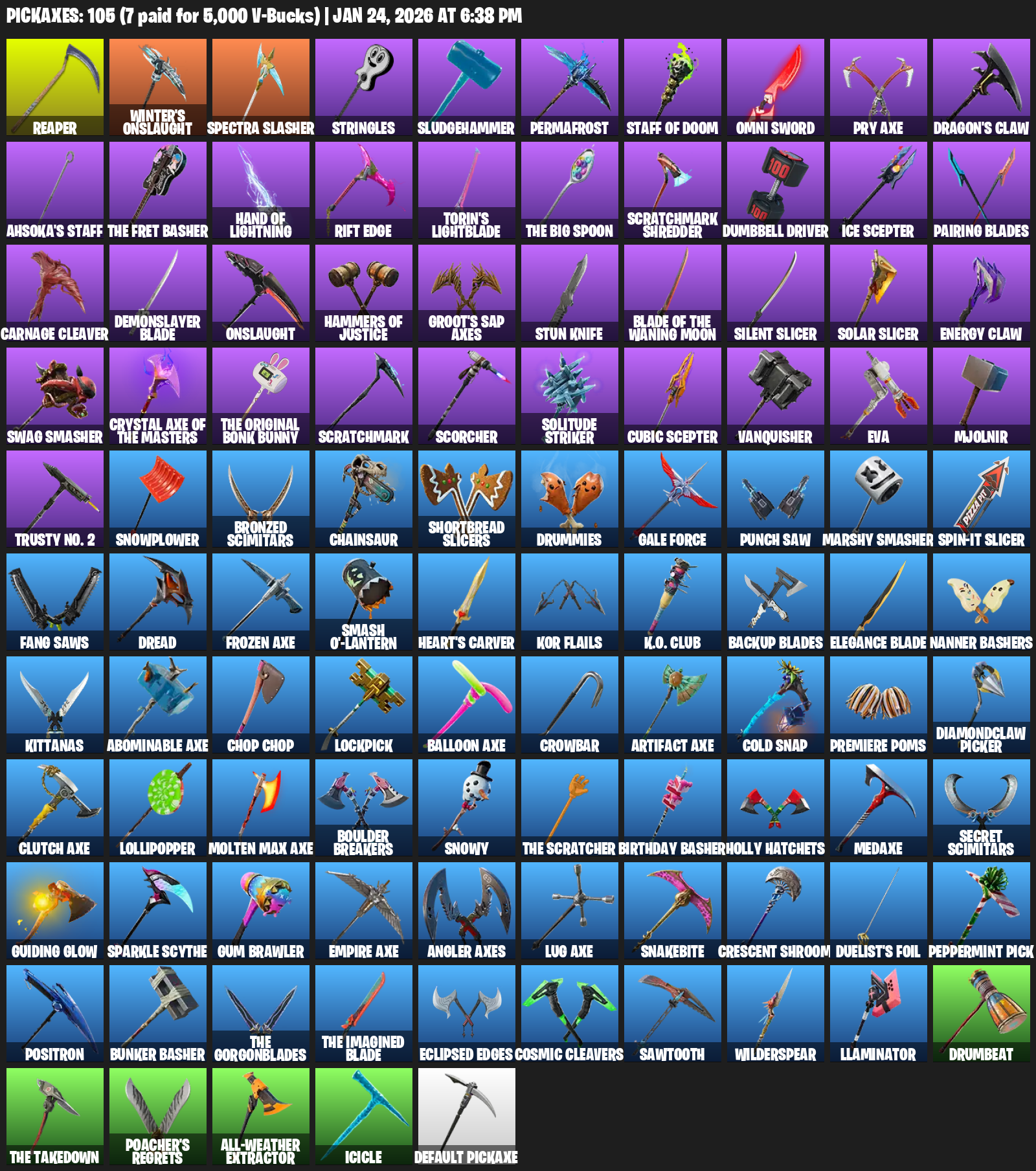 Reaper, Winter’s Onslaught, Spectra Slasher, Stringles, Sludgehammer, Permafrost, Staff of Doom, Omni Sword, Pry Axe, Dragon’s Claw, Rift Edge, Torin’s Lightblade, Scratchmark Shredder, Dumbbell Driver, Ice Scepter, Pairing Blades
