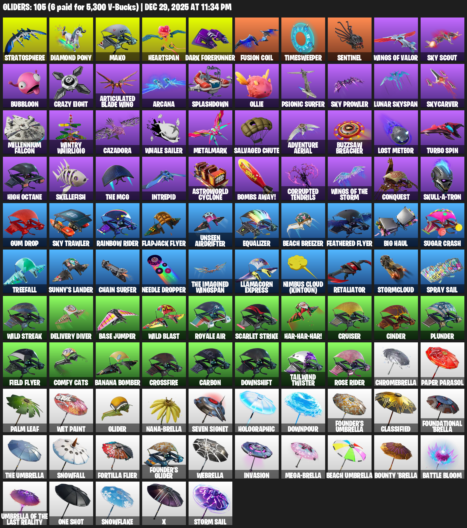 Mako, Stratosphere, Diamond Pony, Heartspan, Fusion Coil, Timesweeper, Sky Scout, Bubbloon, Crazy Eight, Arcana, Splashdown, Ollie, Psionic Surfer, Lunar Skyspan, Skycarver