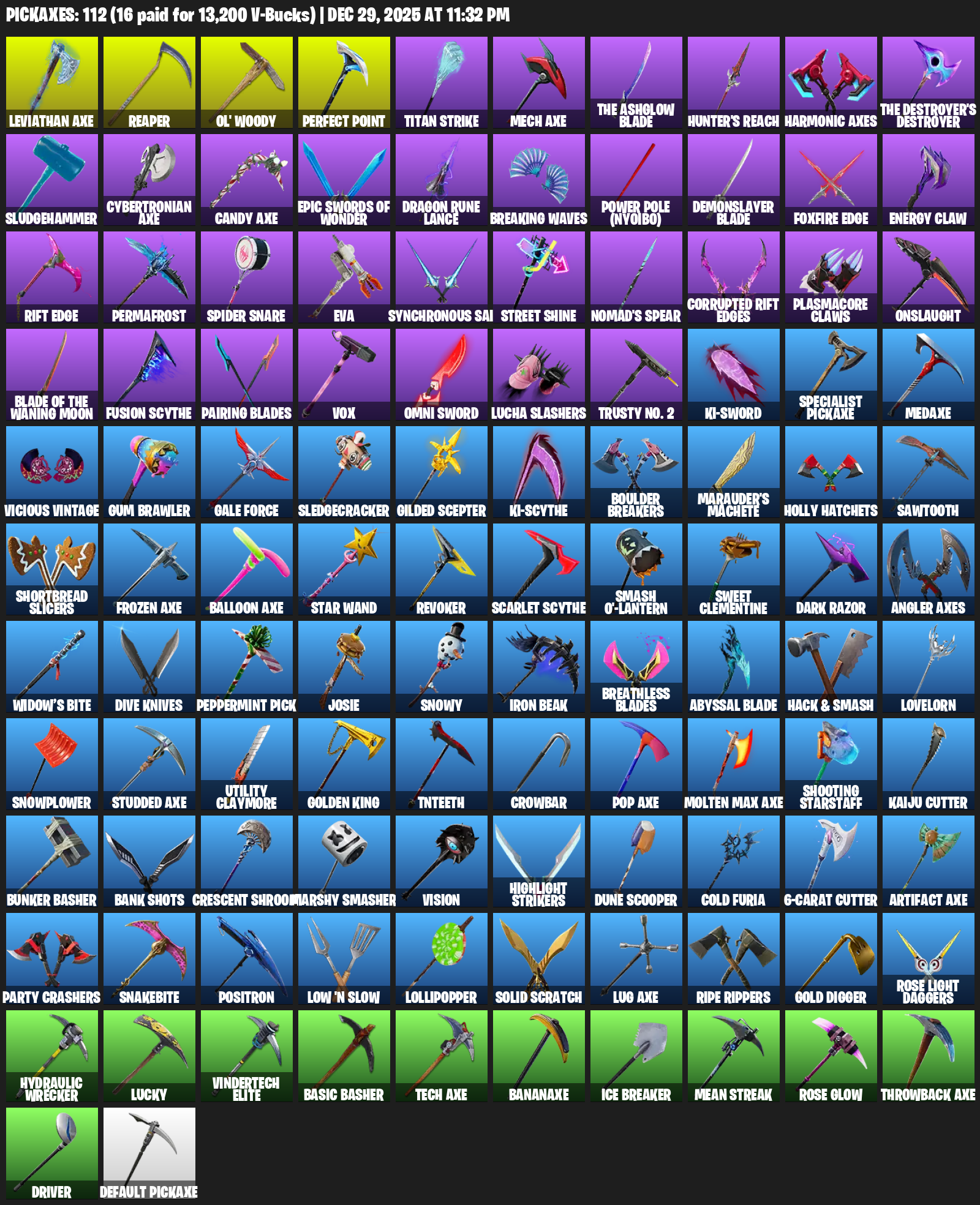 Leviathan Axe, Ol’ Woody, Titan Strike, Hunter’s Reach, Harmonic Axes, Sludgehammer, Dragon Rune Lance, Breaking Waves, Power Pole (Nyoibo), Demonslayer Blade, Foxfire Edge, Energy Claw