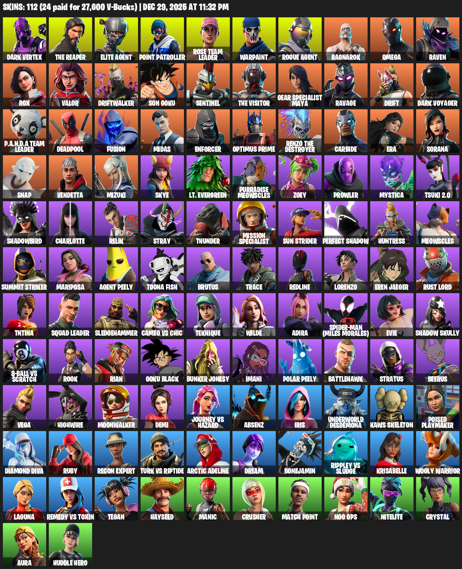 The Reaper, Elite Agent, Point Patroller, Omega, Gear Specialist Maya, Dark Vertex, Rose Team Leader, Warpaint, Ragnarok, Raven, Rox, Valor, Driftwalker, Son Goku, Sentinel, Ravage, Drift