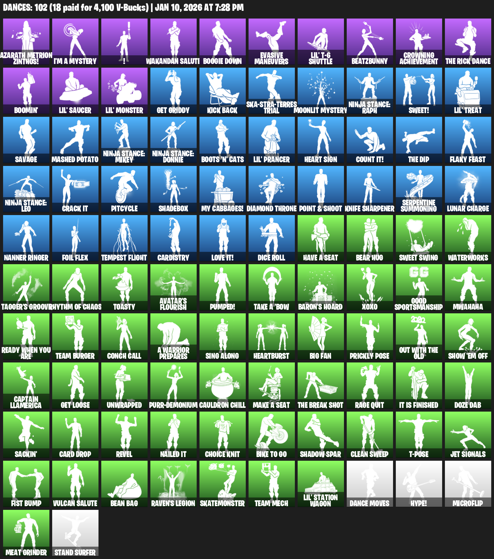 Azarath Metrion Zinthos!, I’m a Mystery, !, Wakandan Salute, Boogie Down, Evasive Maneuvers, Lil’ T-6 Shuttle, BeatzBunny, Crowning Achievement, Boomin’, Get Griddy, Kick Back, Ska-stra-terrestrial, Ninja Stance: Raph, Sweet!