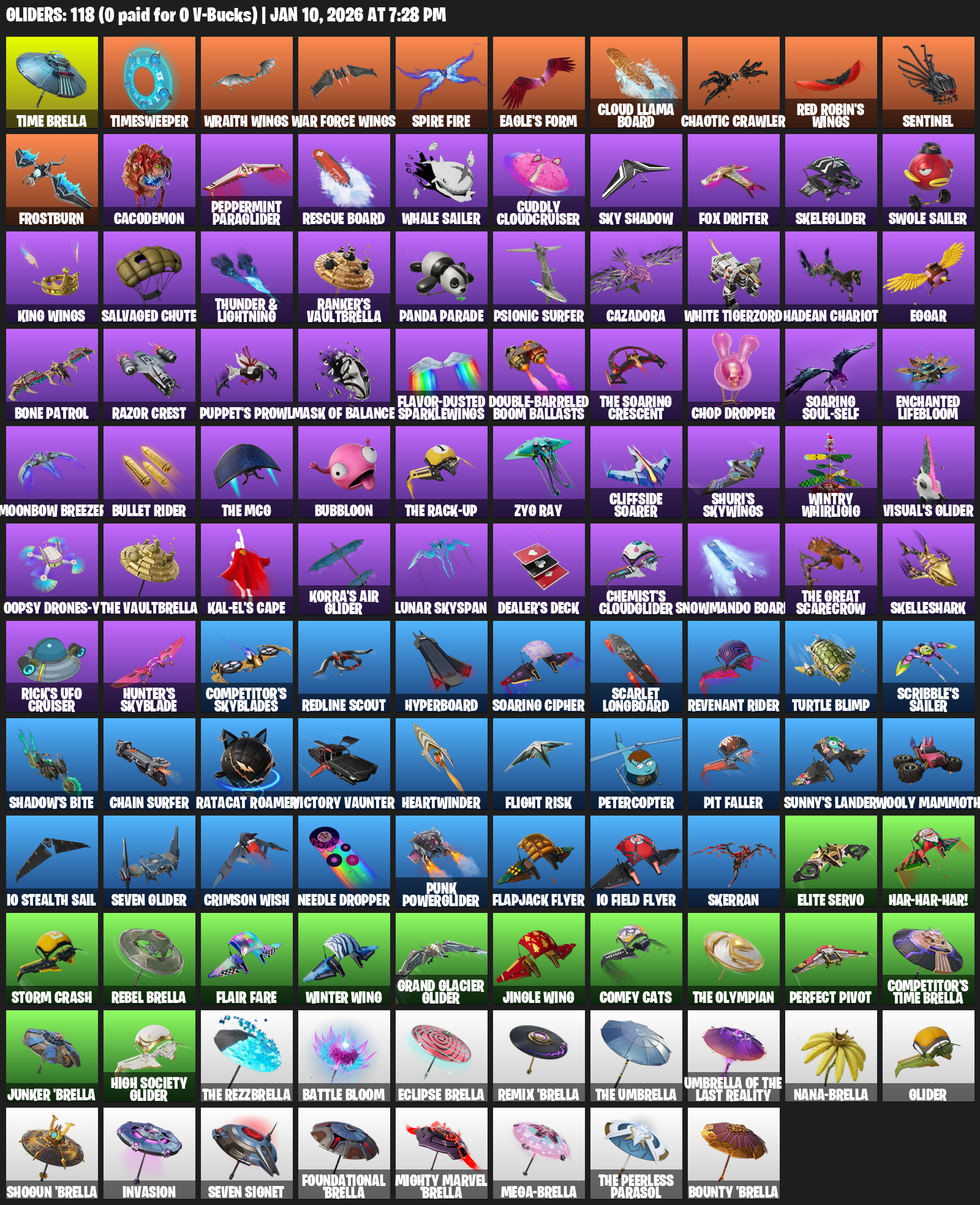Time Brella, Timesweeper, Wraith Wings, Eagle’s Form, Cloud Llama Board, Chaotic Crawler, Sentinel, Frostburn, Cacodemon, Peppermint Paraglider, Whale Sailer, Cuddly Cloudcruiser, Fox Drifter, Skeleglider