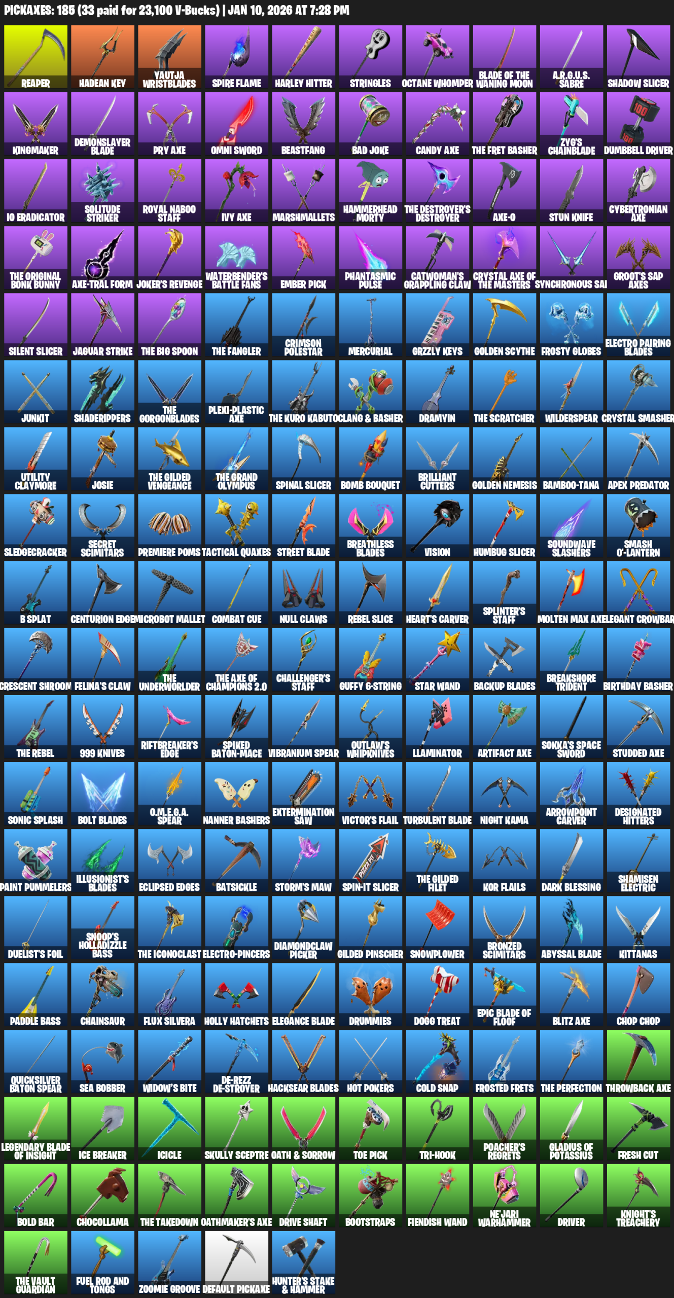 Reaper, Hadean Key, Yautja Wristblades, Harley Hitter, Stringles, Octane Whomper, A.R.G.U.S. Sabre, Shadow Slicer, Kingmaker, Demonslayer Blade, Pry Axe, Omni Sword, Beastfang, Bad Joke, Zyg’s Chainblade, Dumbbell Driver