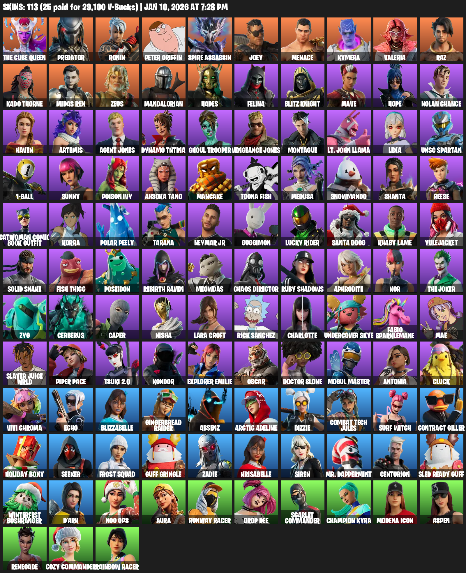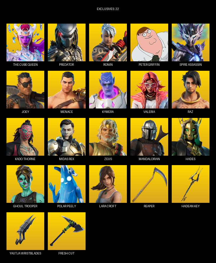 Lara Croft, The Cube Queen, Predator, Ronin, Peter Griffin, Spire Assassin, Joey, Menace, Kymera, Valeria, Raz, Kado Thorne, Midas Rex, Zeus, Mandalorian, Hades, Felina, Blitz Knight, Mave, Hope