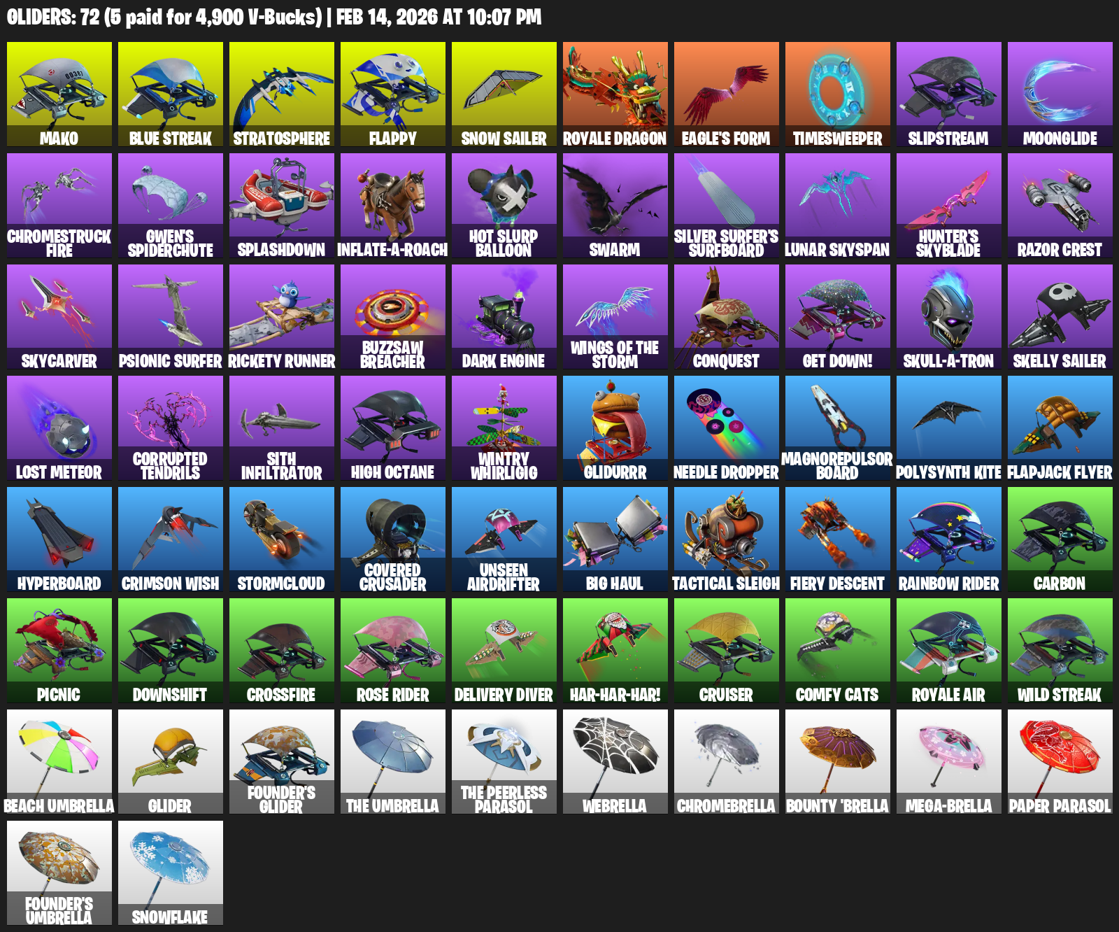 Mako, Stratosphere, Flappy, Snow Sailer, Eagle’s Form, Timesweeper, Slipstream, Moonglide, Chromestruck Fire, Gwen’s Spiderchute, Splashdown, Inflate-A-Roach, Hot Slurp Balloon, Swarm, Silver Surfer’s Surfboard, Lunar Skyspan, Hunter’s Skyblade, Razor Crest