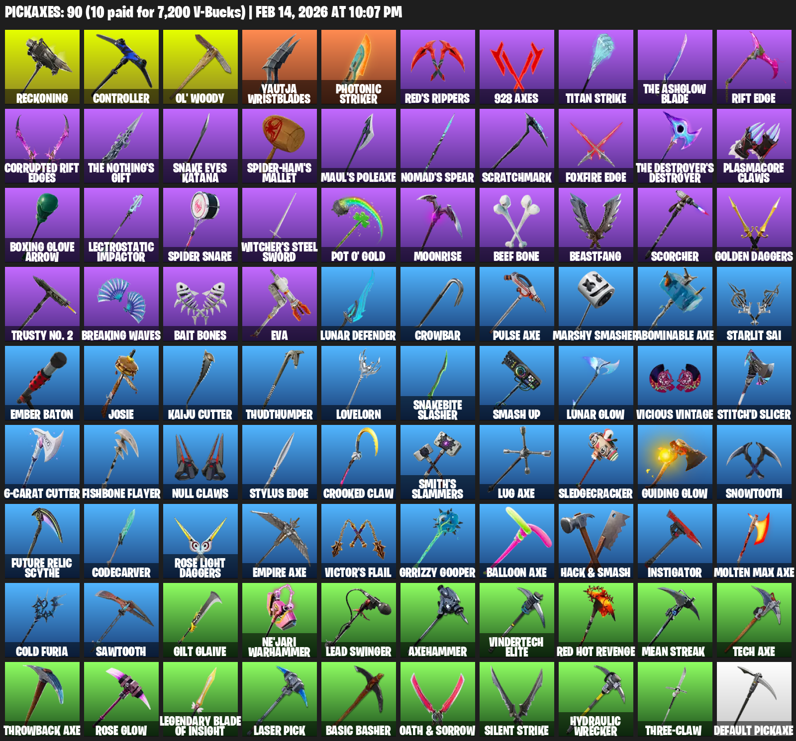 Reckoning, Controller, Ol’ Woody, Yautja Wristblades, Red’s Rippers, 928 Axes, Titan Strike, Rift Edge, Snake Eyes Katana, Spider-Ham’s Mallet, Maul’s Poleaxe, Nomad’s Spear, Scratchmark, Plasmacore Claws
