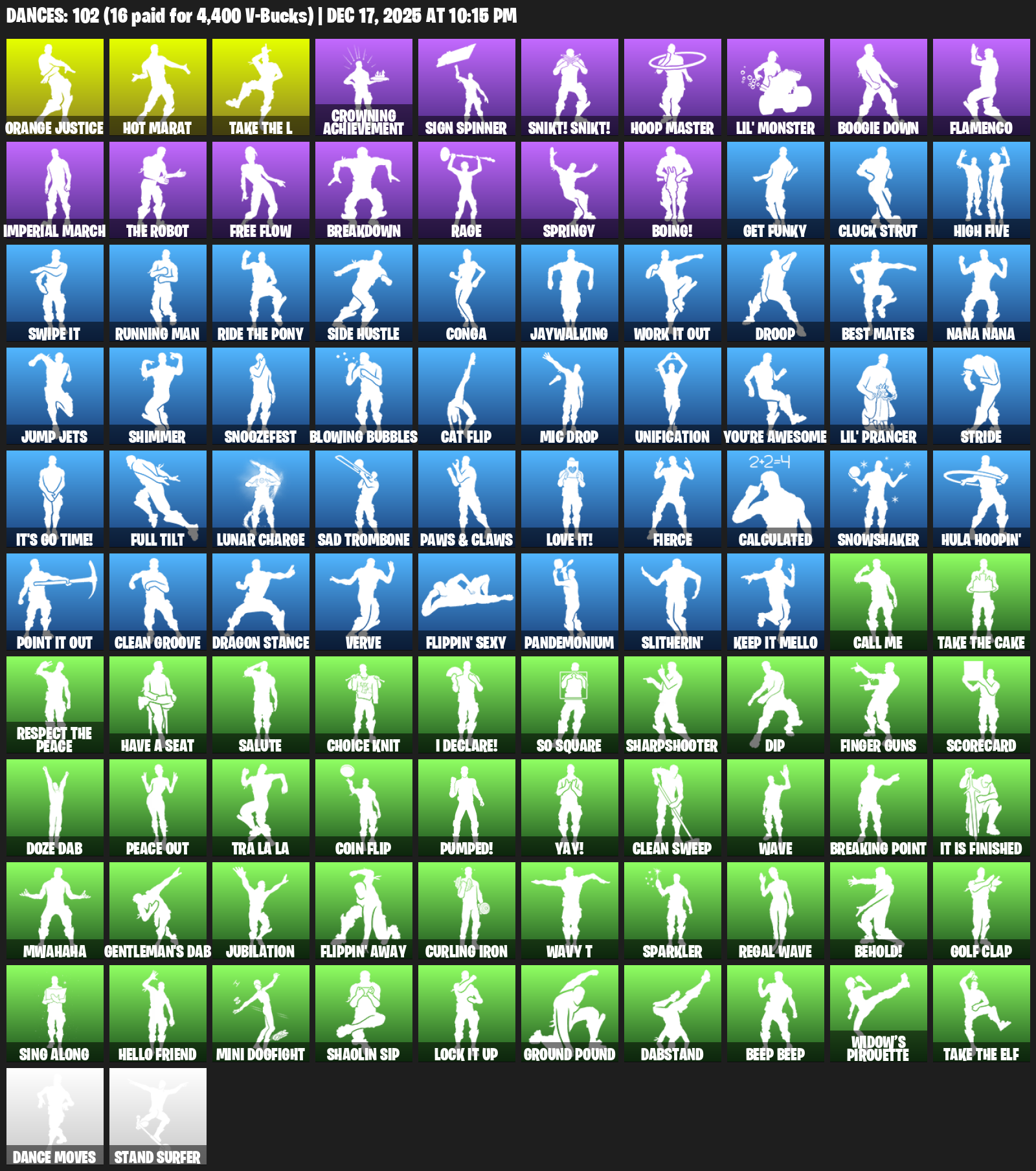 Hot Marat, Orange Justice, Crowning Achievement, Sign Spinner, Snikt! Snikt!, Hoop Master, Lil’ Monster, Boogie Down, Flamenco, Imperial March, Free Flow, Breakdown, Rage, Springy, Boing!, Get Funky, Cluck Strut, High Five