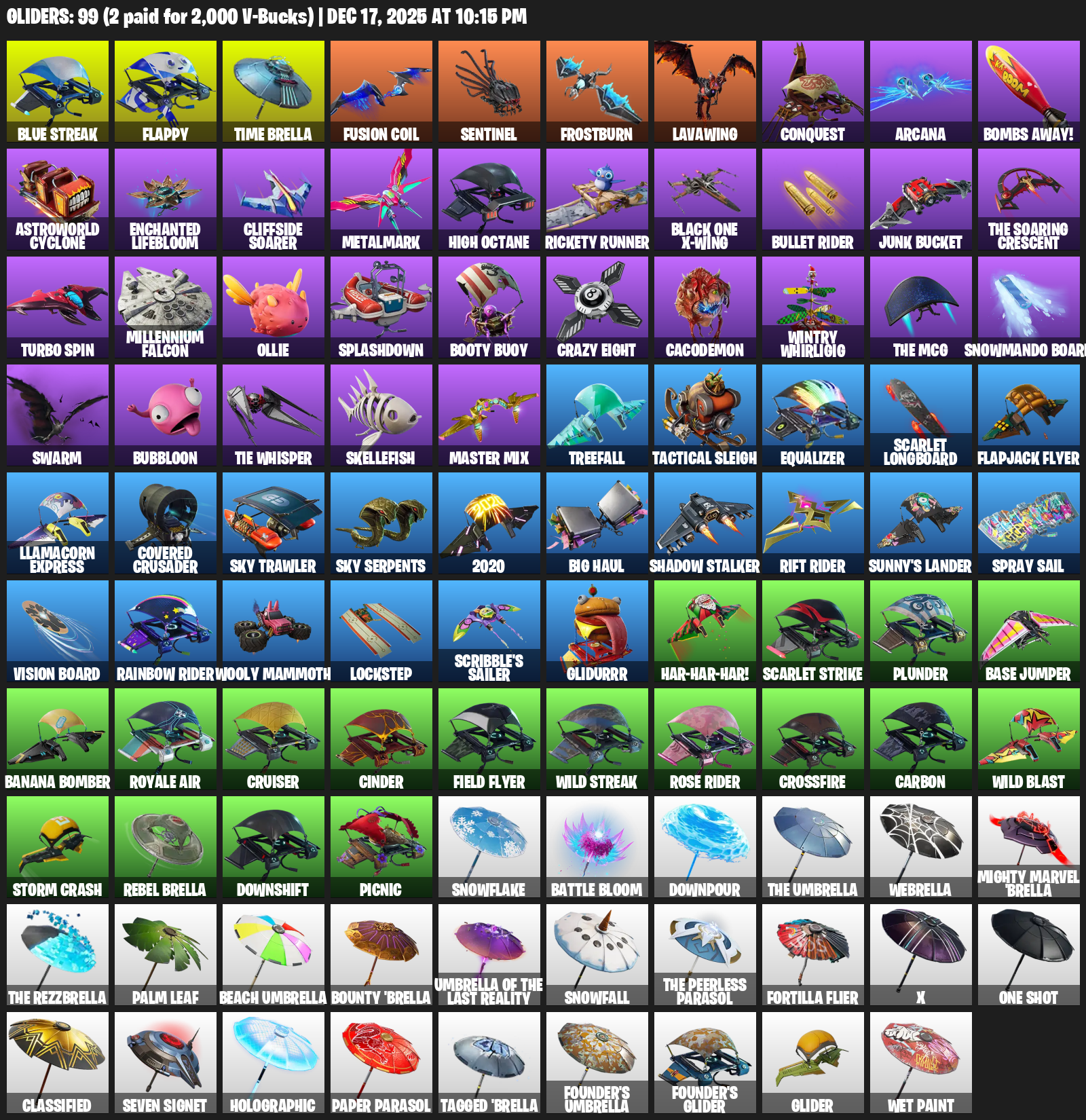 Blue Streak, Flappy, Time Brella, Sentinel, Frostburn, Lavawing, Conquest, Arcana, Bombs Away!, Astroworld Cyclone, Enchanted Lifebloom, Cliffside Soarer, Metalmark, Rickety Runner, Black One X-wing, Bullet Rider, Junk Bucket