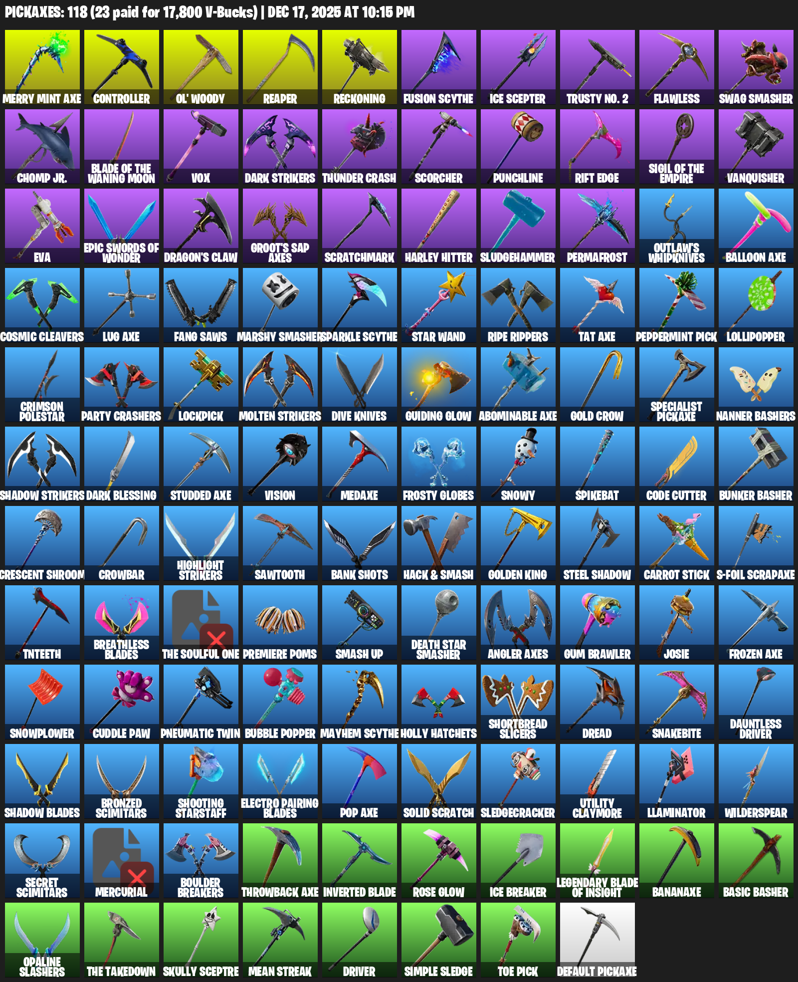Merry Mint Axe, Controller, Ol’ Woody, Reckoning, Fusion Scythe, Ice Scepter, Trusty No. 2, Flawless, Swag Smasher, Chomp Jr., Vox, Thunder Crash, Scorcher, Punchline, Rift Edge, Vanquisher