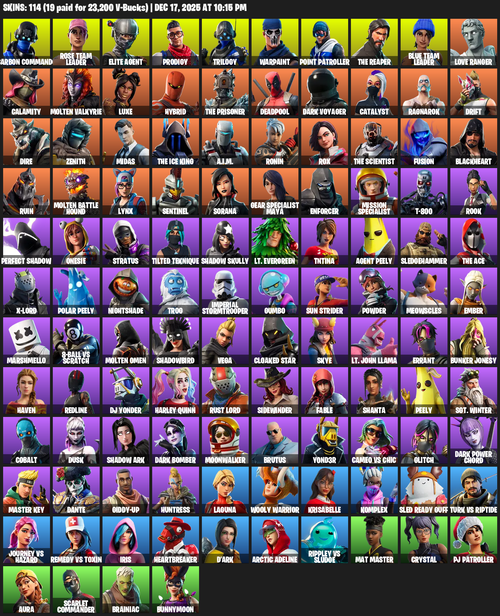 Elite Agent, Point Patroller, The Reaper, Gear Specialist Maya, Carbon Commando, Rose Team Leader, Prodigy, Trilogy, Warpaint, Love Ranger, Calamity, Molten Valkyrie, Luxe, Hybrid, Deadpool, Dark Voyager, Catalyst, Ragnarok