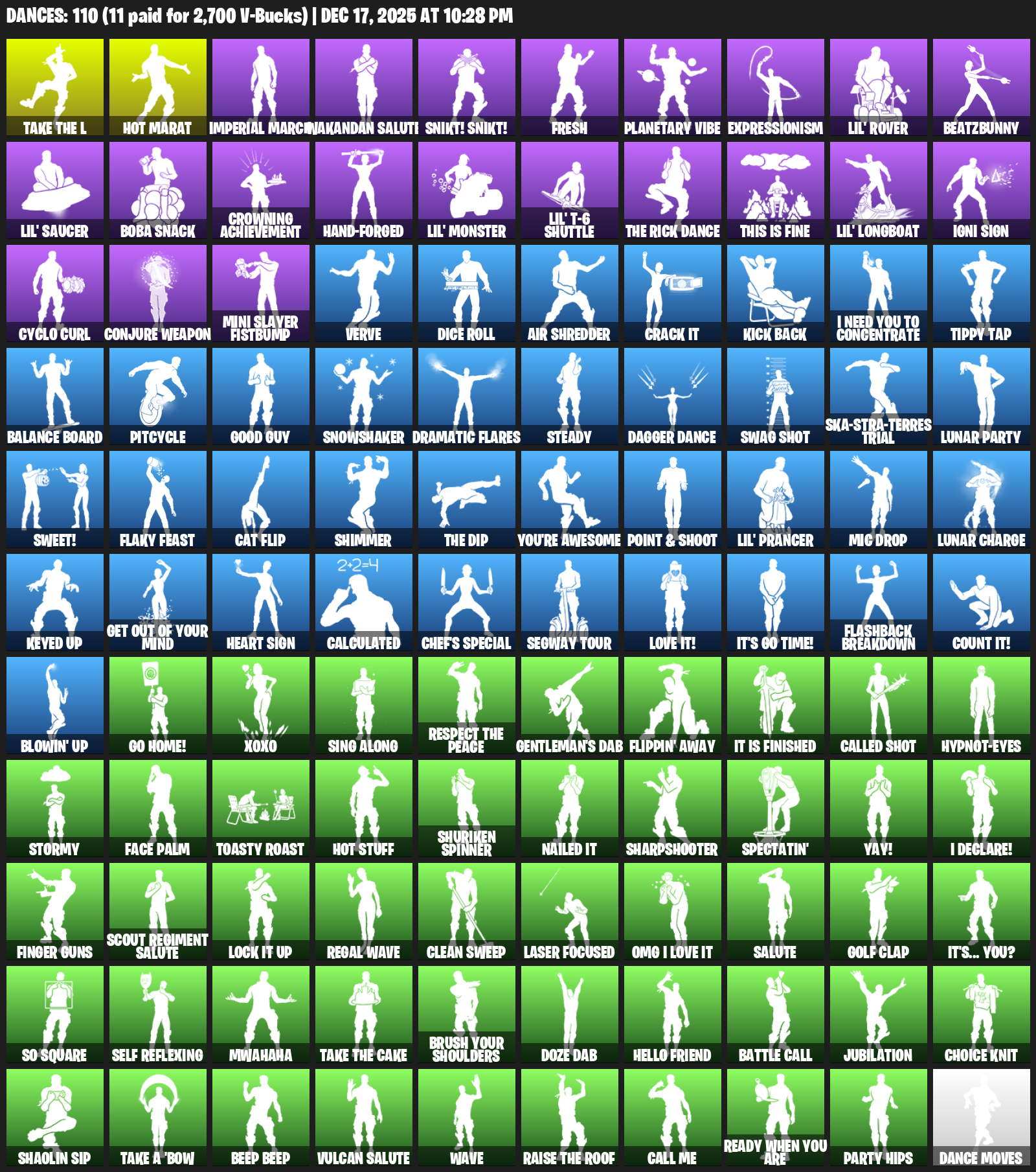 Hot Marat, Imperial March, Wakandan Salute, Snikt! Snikt!, Fresh, Planetary Vibe, Expressionism, Lil’ Rover, BeatzBunny, Boba Snack, Crowning Achievement, Hand-Forged, This is Fine, Igni Sign
