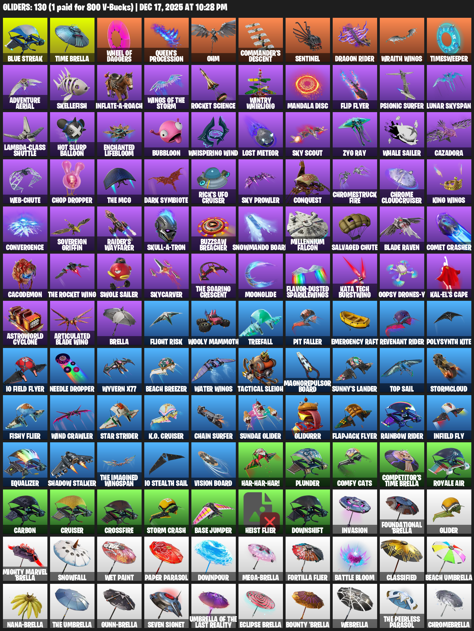 Time Brella, Wheel of Daggers, Queen’s Procession, Ohm, Commander’s Descent, Sentinel, Dragon Rider, Wraith Wings, Timesweeper, Adventure Aerial, Skellefish, Inflate-A-Roach, Rocket Science, Wintry Whirligig, Mandala Disc, Flip Flyer, Psionic Surfer, Lunar Skyspan