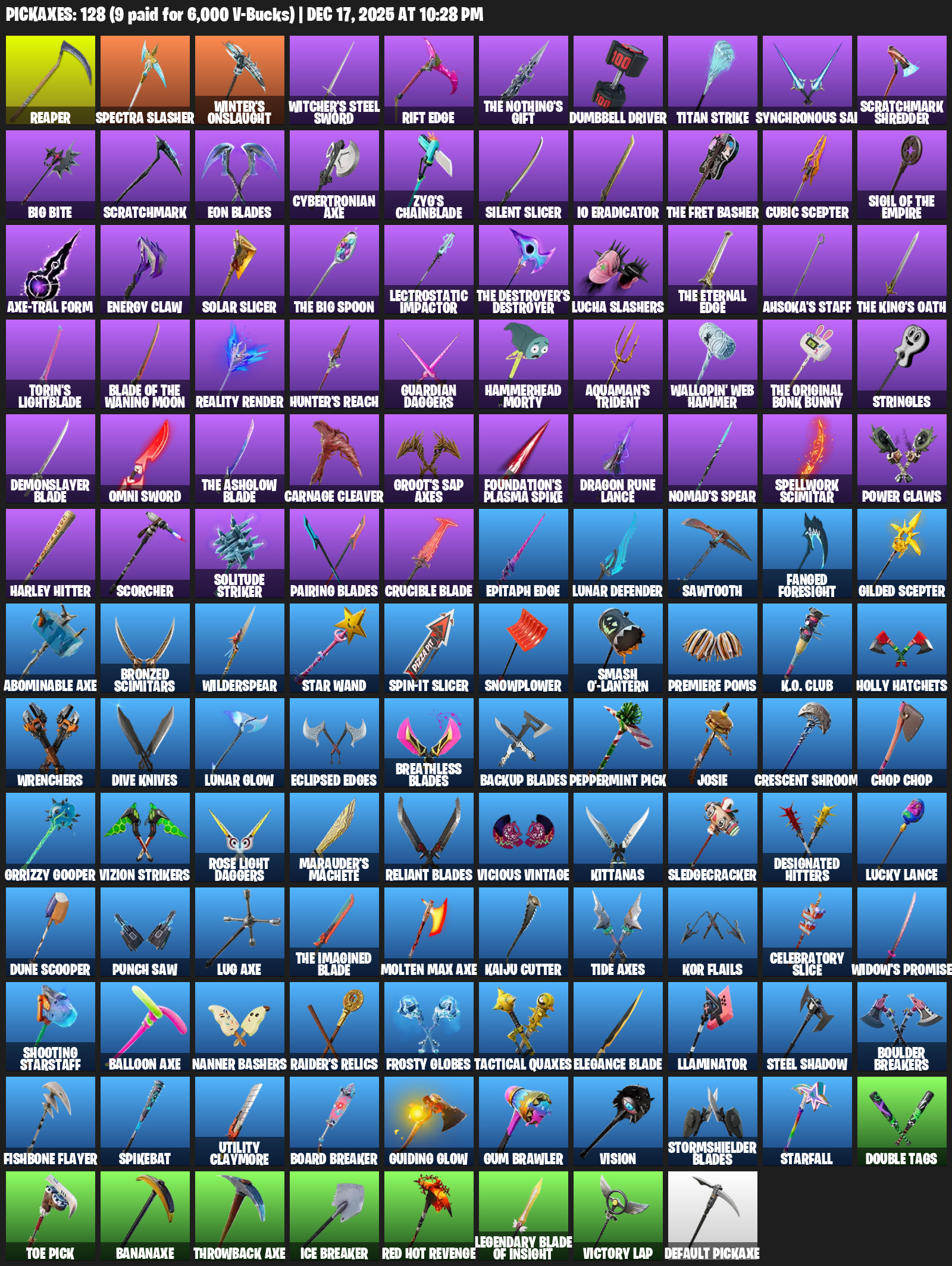 Reaper, Spectra Slasher, Winter’s Onslaught, Witcher’s Steel Sword, Rift Edge, Dumbbell Driver, Titan Strike, Synchronous Sai, Scratchmark Shredder, Big Bite, Eon Blades, Cybertronian Axe, Zyg’s Chainblade, Silent Slicer, IO Eradicator, Cubic Scepter