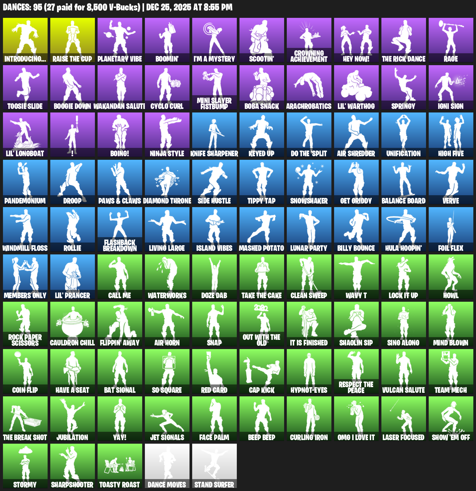 Introducing…, Planetary Vibe, Boomin’, I’m a Mystery, Scootin’, Crowning Achievement, Hey Now!, Rage, Toosie Slide, Boogie Down, Wakandan Salute, Cyclo Curl, Mini Slayer Fistbump, Boba Snack, Arachrobatics, Lil’ Warthog, Springy, Igni Sign