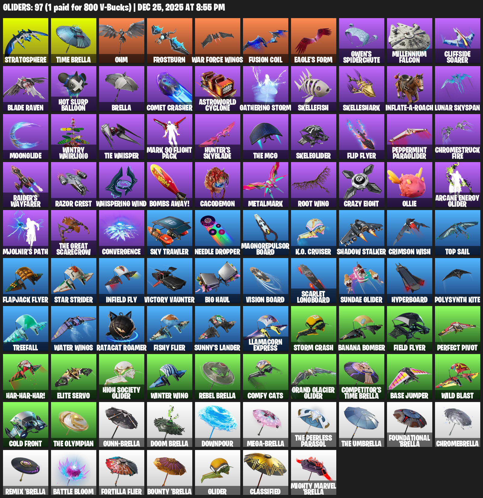 Stratosphere, Time Brella, Ohm, Frostburn, War Force Wings, Eagle’s Form, Gwen’s Spiderchute, Millennium Falcon, Cliffside Soarer, Hot Slurp Balloon, Comet Crasher, Astroworld Cyclone, Gathering Storm, Skellefish, Skelleshark, Lunar Skyspan