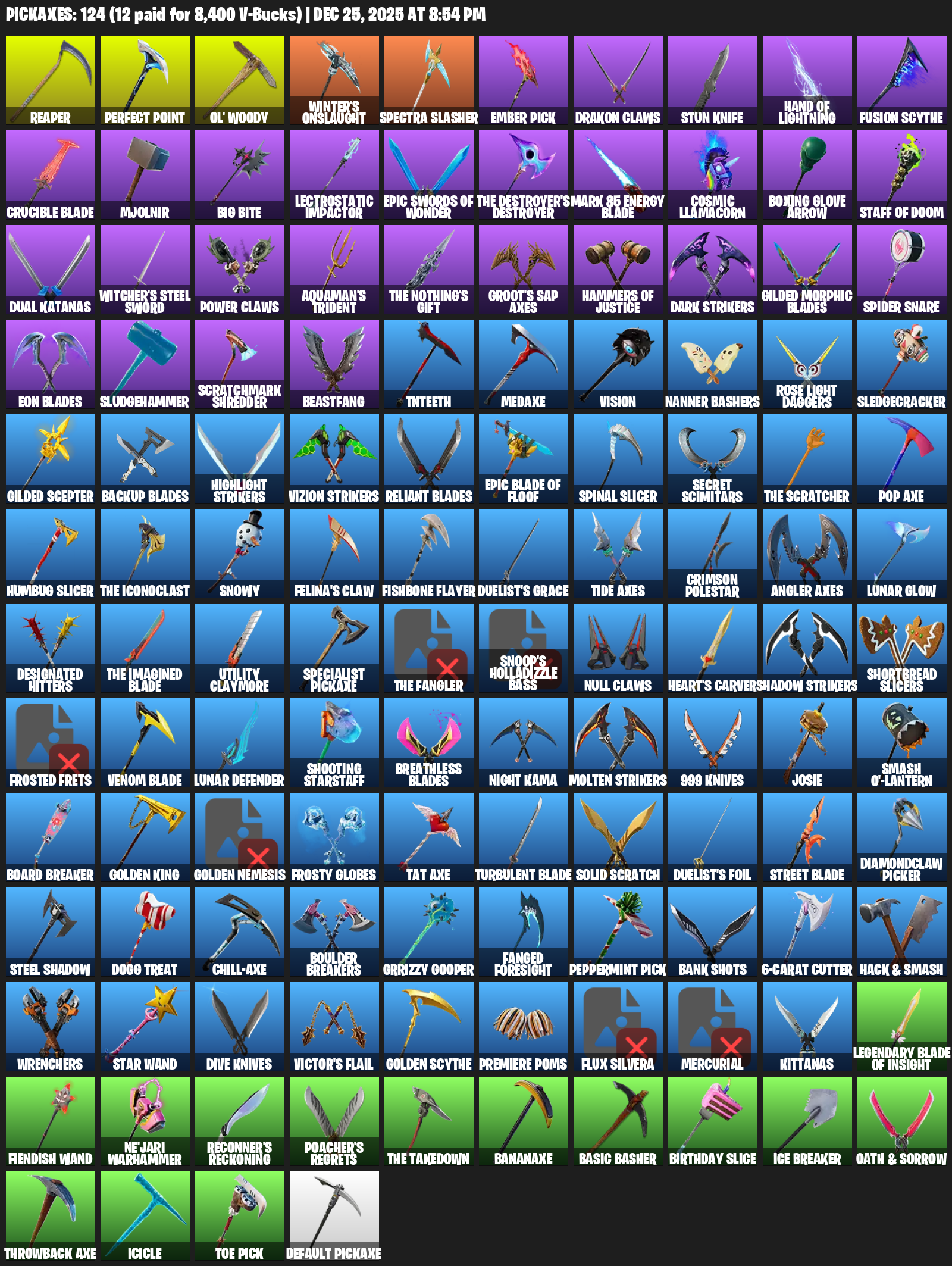 Reaper, Ol’ Woody, Winter’s Onslaught, Spectra Slasher, Ember Pick, Drakon Claws, Stun Knife, Hand of Lightning, Crucible Blade, Mjolnir, Big Bite, Lectrostatic Impactor, The Destroyer’s Destroyer, Cosmic Llamacorn, Boxing Glove Arrow