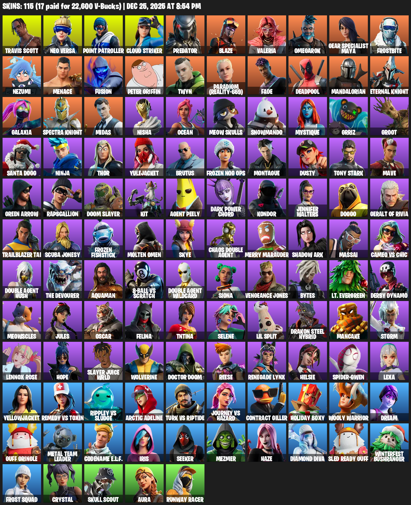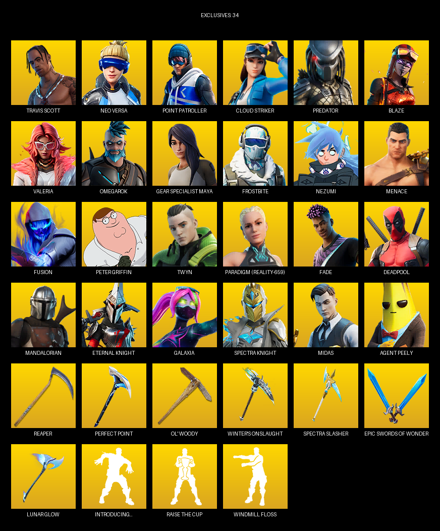 Travis Scott, Point Patroller, Gear Specialist Maya, Neo Versa, Cloud Striker, Predator, Blaze, Valeria, Omegarok, Frostbite, Nezumi, Menace, Fusion, Peter Griffin, Twyn, Paradigm (Reality-659), Fade, Deadpool, Mandalorian, Eternal Knight