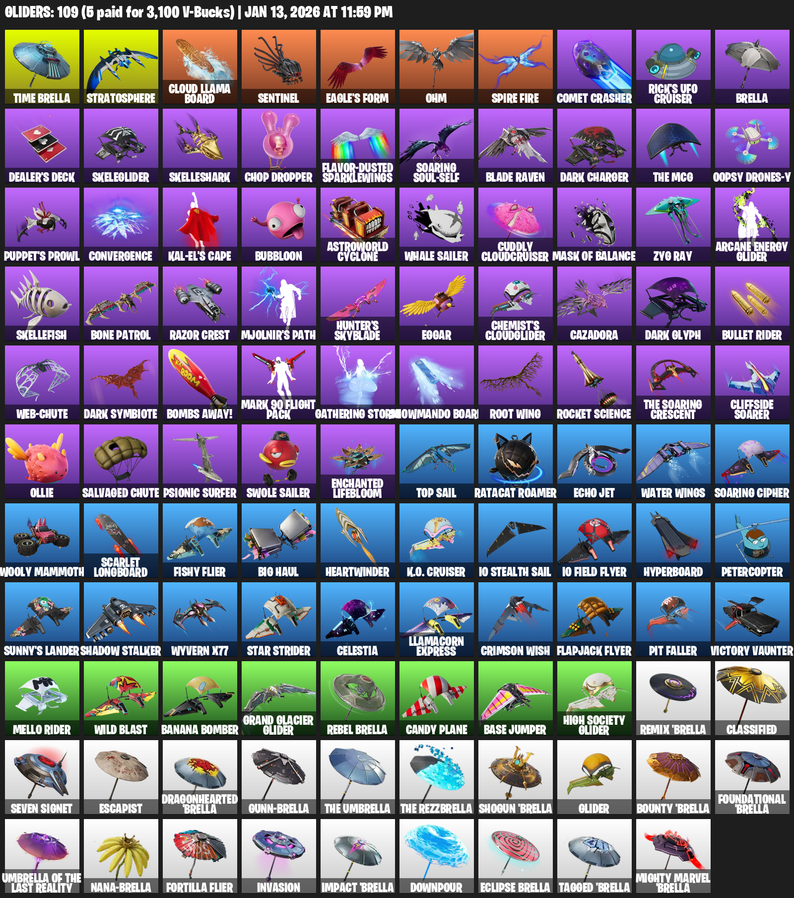 Time Brella, Stratosphere, Cloud Llama Board, Sentinel, Eagle’s Form, Ohm, Spire Fire, Comet Crasher, Rick’s UFO Cruiser, Dealer’s Deck, Skeleglider, Skelleshark, Chop Dropper, Flavor-Dusted Sparklewings, Soaring Soul-Self, Oopsy Drones-y