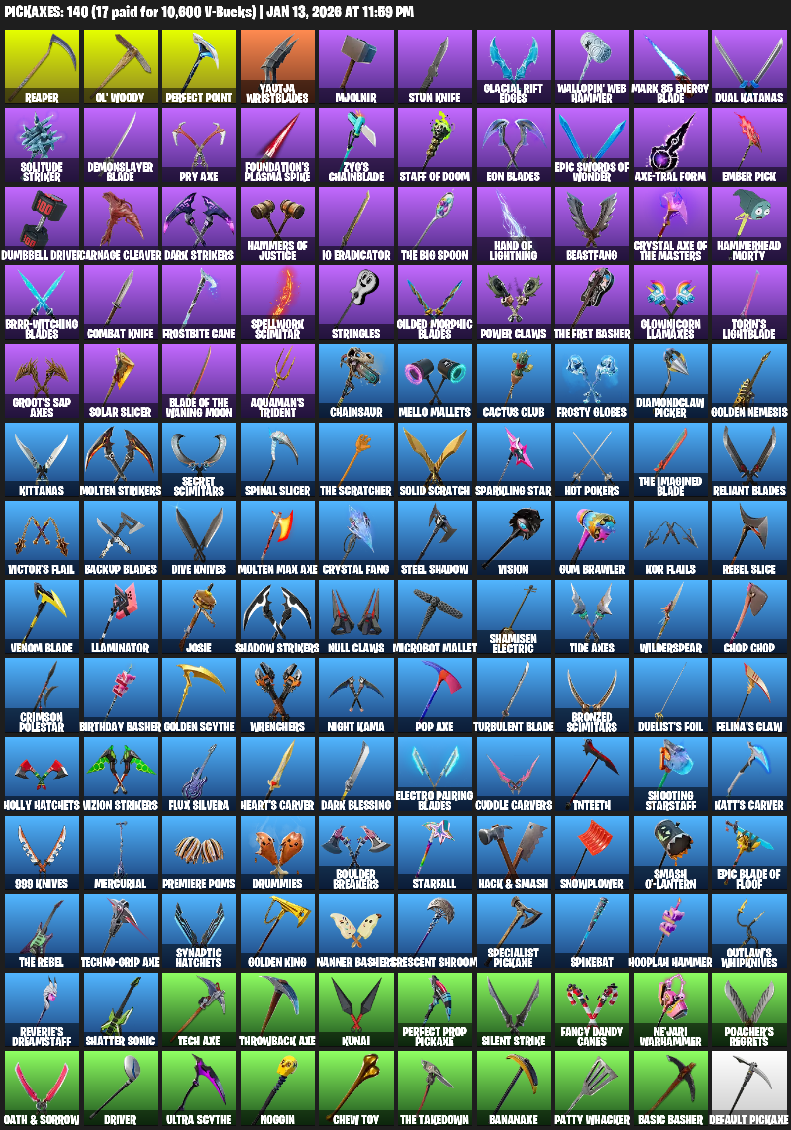 Reaper, Ol’ Woody, Perfect Point, Yautja Wristblades, Mjolnir, Stun Knife, Glacial Rift Edges, Wallopin’ Web Hammer, Mark 85 Energy Blade, Dual Katanas, Solitude Striker, Pry Axe, Foundation’s Plasma Spike, Zyg’s Chainblade, Staff of Doom, Eon Blades, Ember Pick