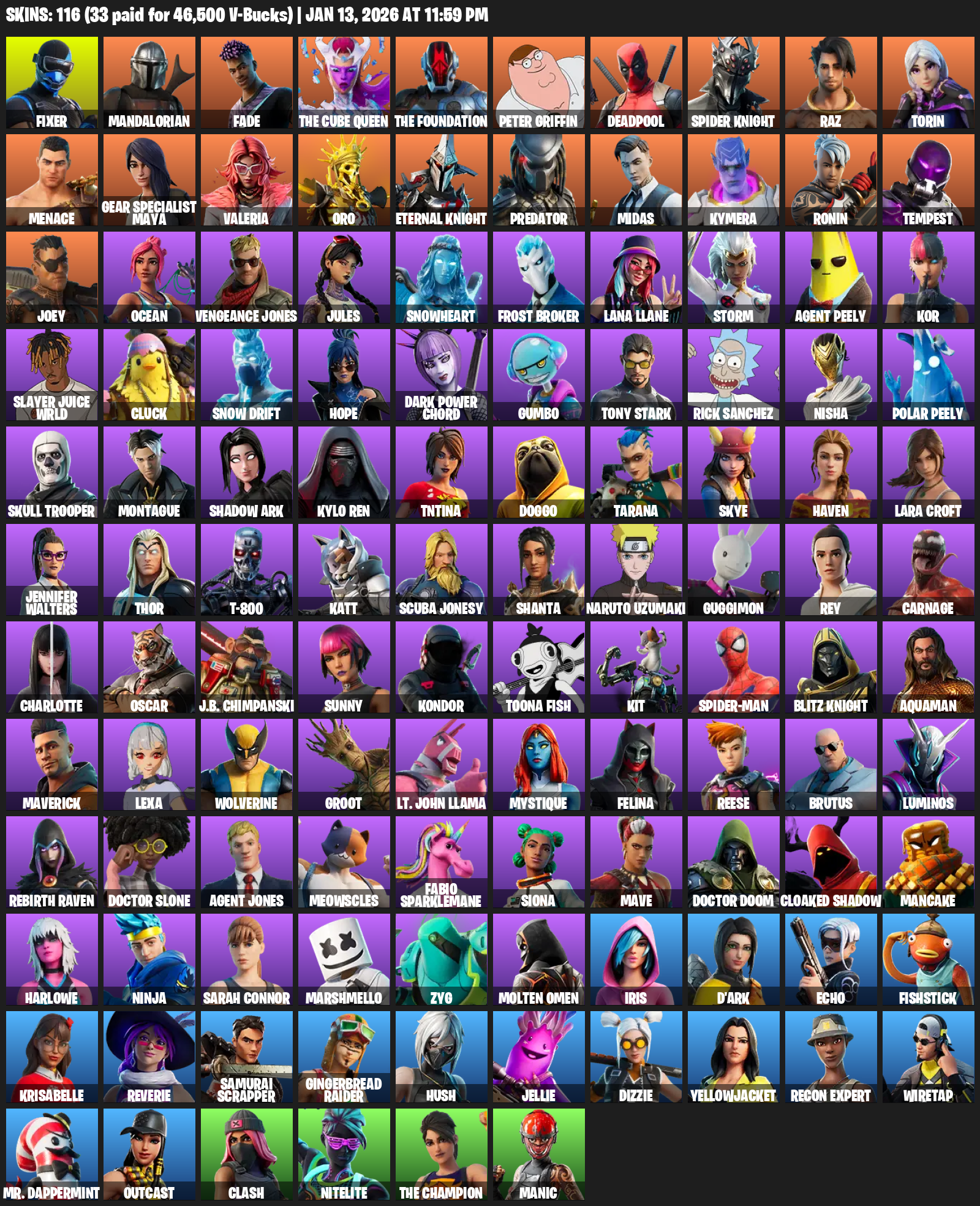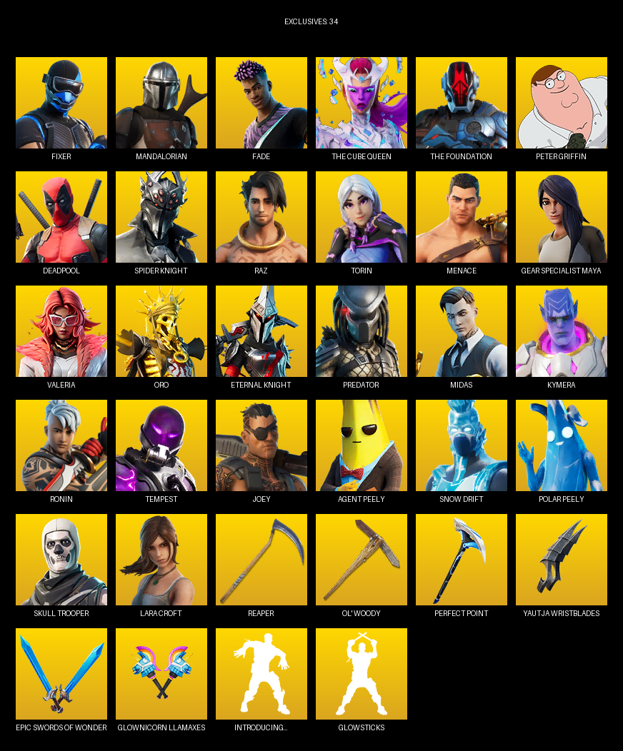 Gear Specialist Maya, Lara Croft, Fixer, Mandalorian, Fade, The Cube Queen, Peter Griffin, Deadpool, Spider Knight, Raz, Torin, Menace, Valeria, Oro, Predator, Midas, Kymera, Ronin