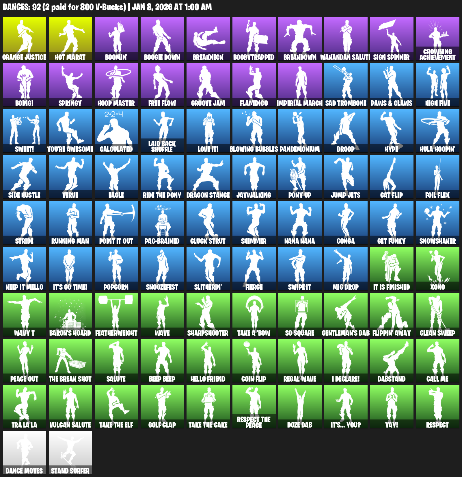 Hot Marat, Boomin’, Boogie Down, Breakneck, Boobytrapped, Breakdown, Wakandan Salute, Sign Spinner, Crowning Achievement, Boing!, Springy, Hoop Master, Free Flow, Groove Jam, Flamenco, Imperial March, Sad Trombone, Paws & Claws, High Five