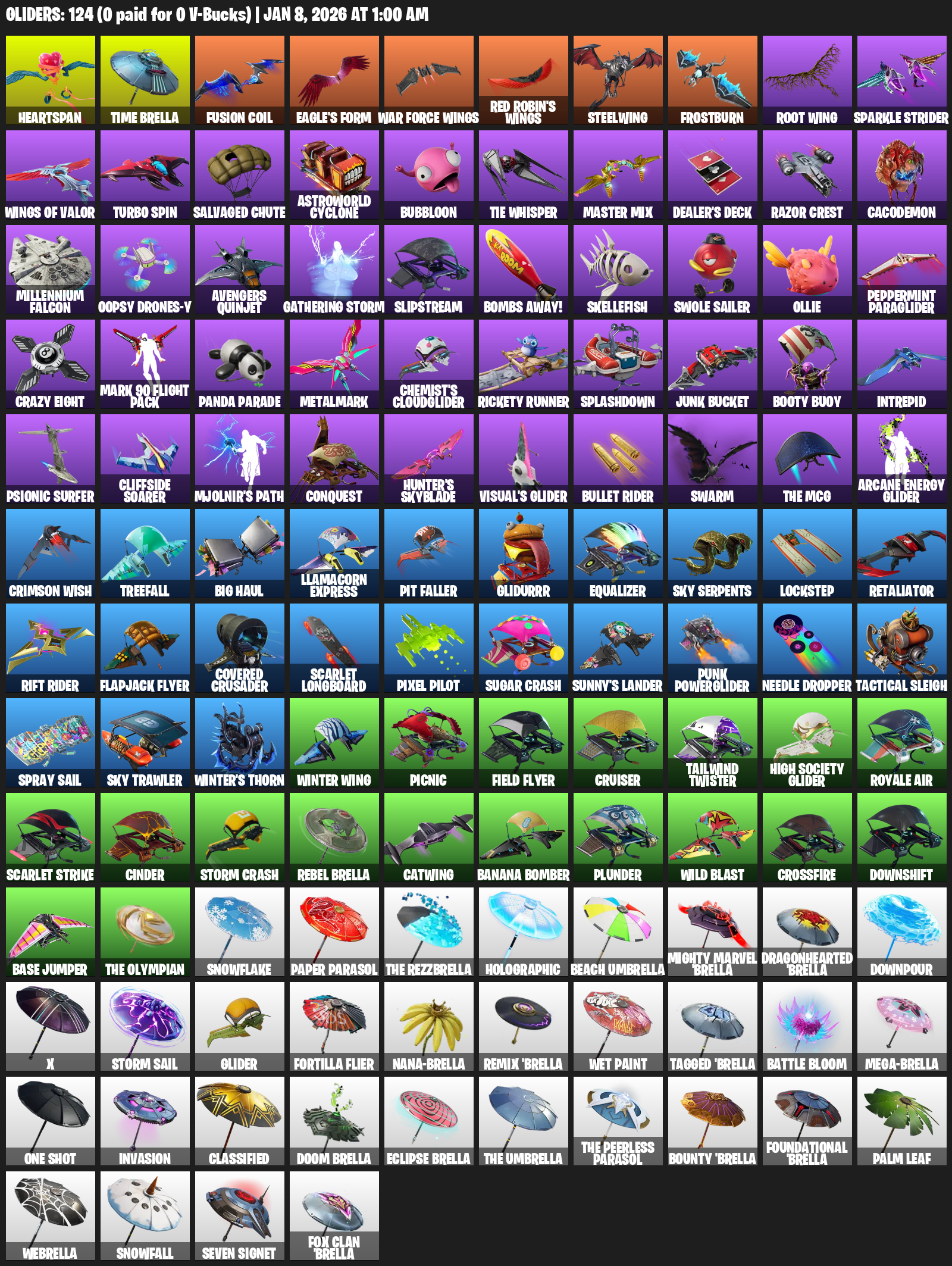 Heartspan, Time Brella, Eagle’s Form, War Force Wings, Steelwing, Frostburn, Root Wing, Sparkle Strider, Turbo Spin, Salvaged Chute, Astroworld Cyclone, Bubbloon, TIE Whisper, Dealer’s Deck, Razor Crest, Cacodemon