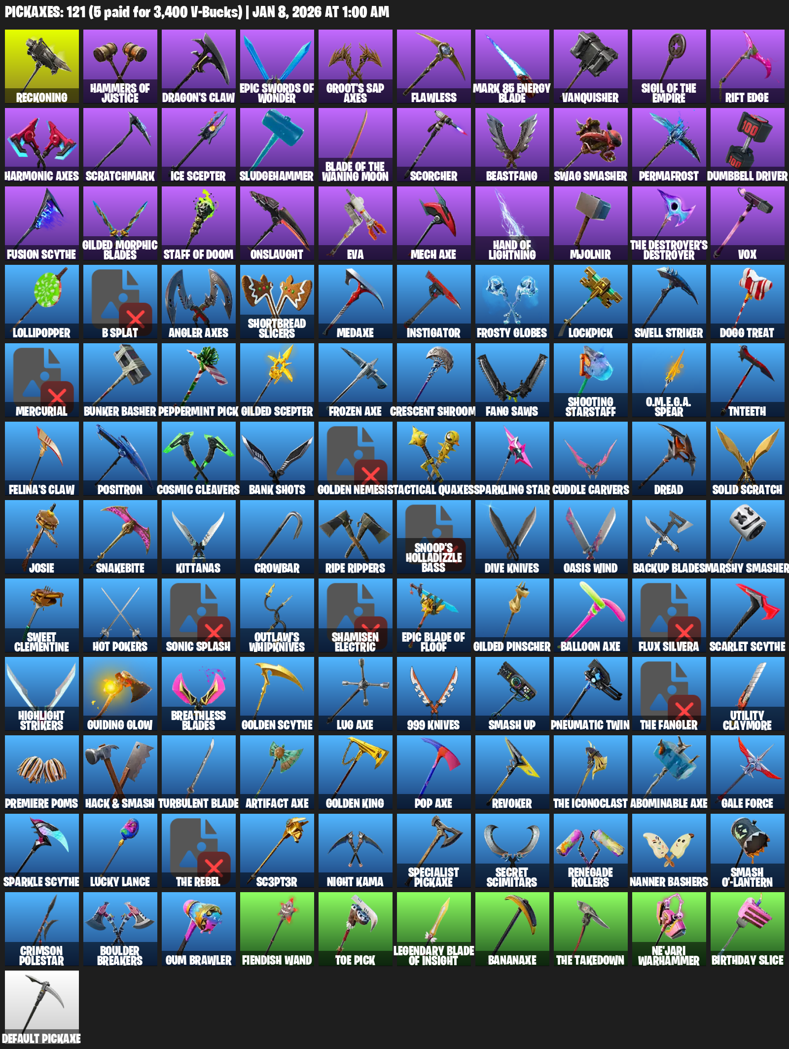 Reckoning, Hammers of Justice, Dragon’s Claw, Groot’s Sap Axes, Flawless, Mark 85 Energy Blade, Vanquisher, Rift Edge, Scratchmark, Ice Scepter, Sludgehammer, Scorcher, Beastfang, Swag Smasher, Permafrost, Dumbbell Driver