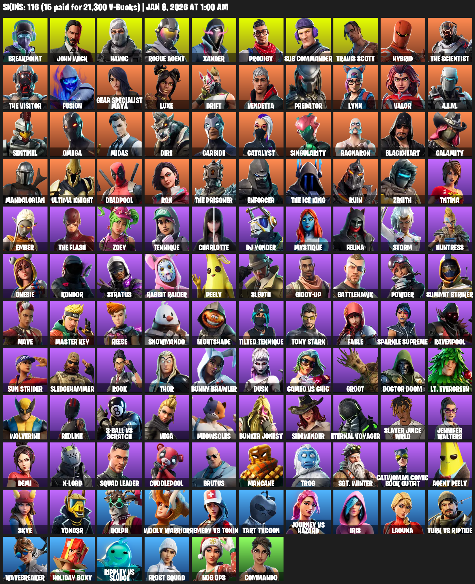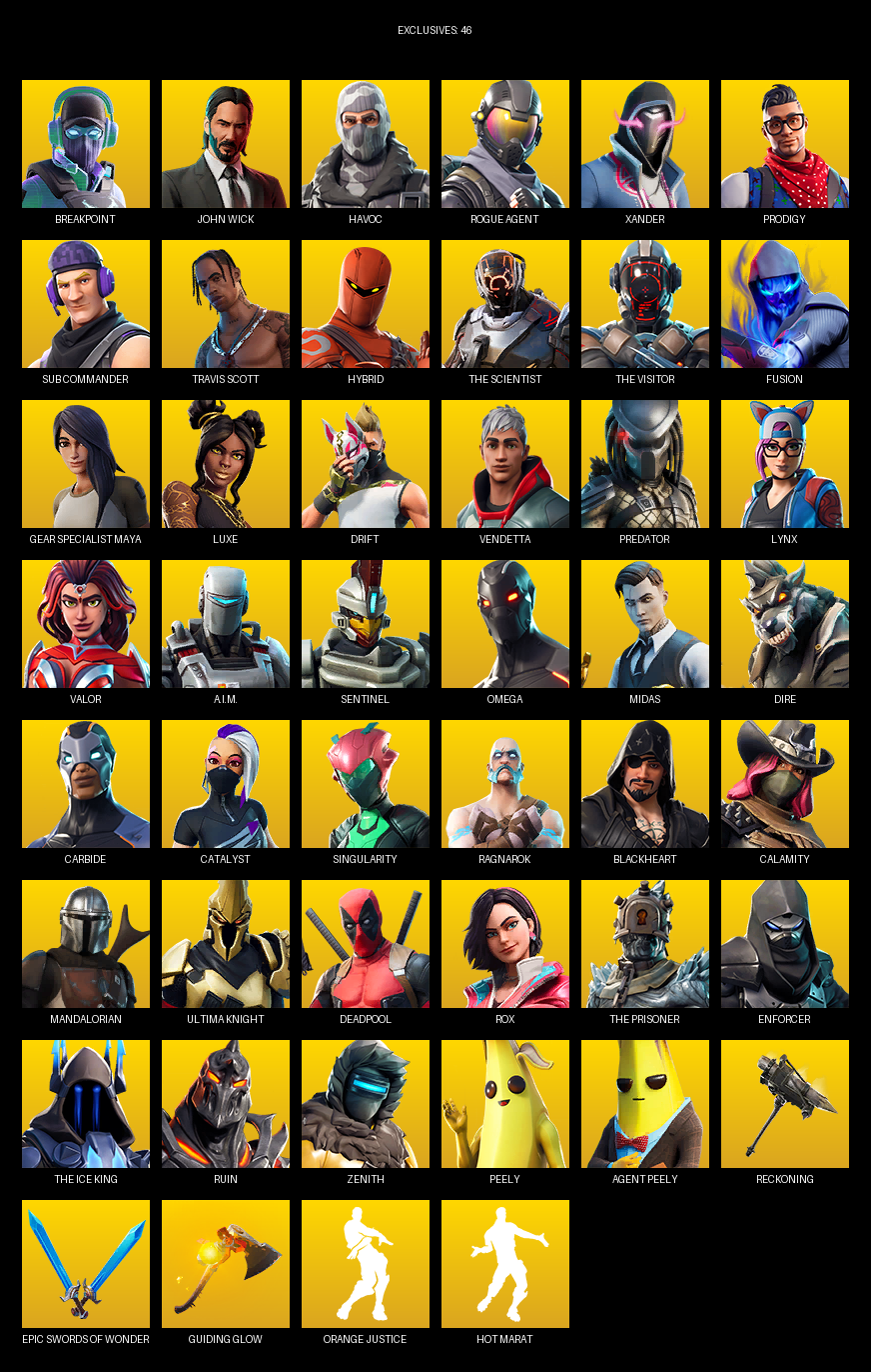 Travis Scott, Gear Specialist Maya, Omega, Breakpoint, John Wick, Havoc, Rogue Agent, Xander, Prodigy, Sub Commander, Hybrid, The Scientist, Fusion, Luxe, Drift, Vendetta, Predator, Lynx, Valor